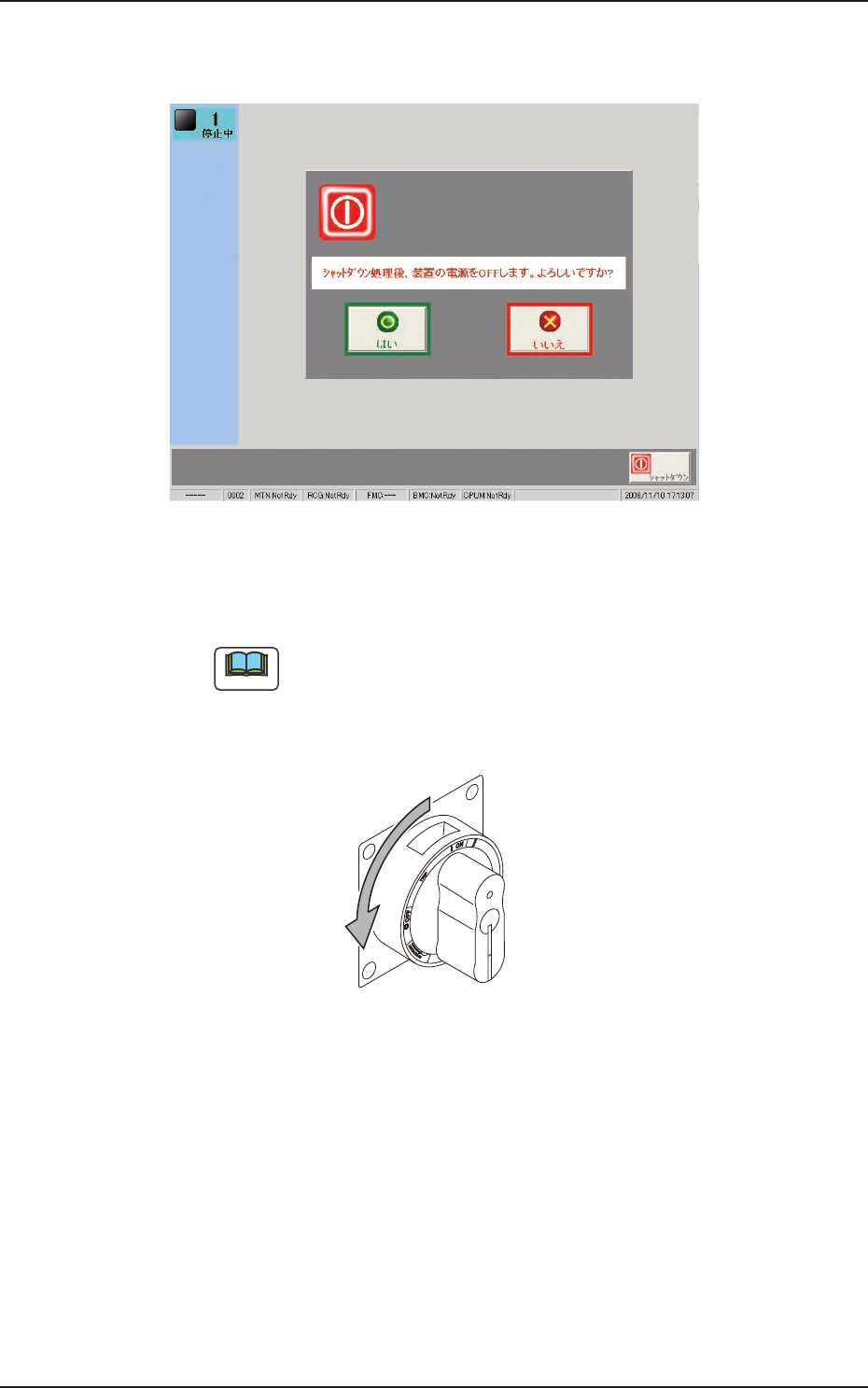 1OM-1750 2-18 (2) トップ画面で [ シャットダウン ] ボタンを押す。 ( シャットダウンの確認画面が表示されます。) F1B14 (3) [ はい ] ボタンを押す。 ( シャットダウン処理後、装置の電源が切れます。) ノート [ いいえ ] ボタンを押すと、シャットダウンを中止し、トップ画面 に戻ります。 (4) 装置前面にある電源ブレーカの操作レバーを OFF の位置にする。 F1B12 1302-001 4.2…