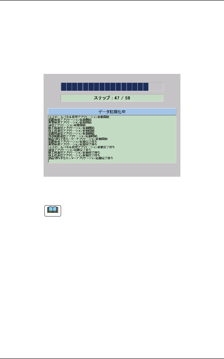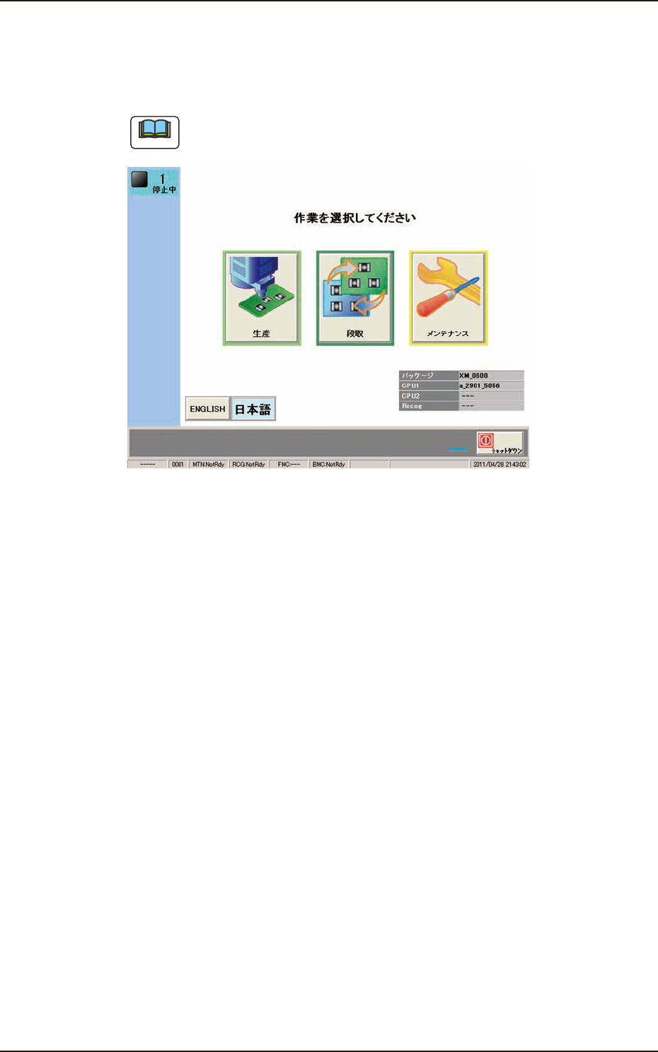 1OM-1750 3-7 1.3 生産運転の始動 1.3.1 システムの起動 装置に電源が投入されていることを確認し、操作パネルの [POWER ON] ボ タンを 1 秒以上押し続けます。 [POWER ON] ボタンが赤色に点灯し、システムが起動して、装置が自己診 断を開始します。 自己診断 ( データ初期化中 ) 画面 F1C6 ノート 装置の自己診断には約 2 ~ 3 分程の時間が掛かります。 画面が切替るまで、そのままお待ちく…