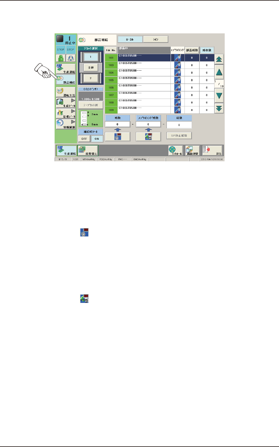 (4) 生産運転メニューで、 [ 部品補給 ] ボタンを押し、“部品補給”画面