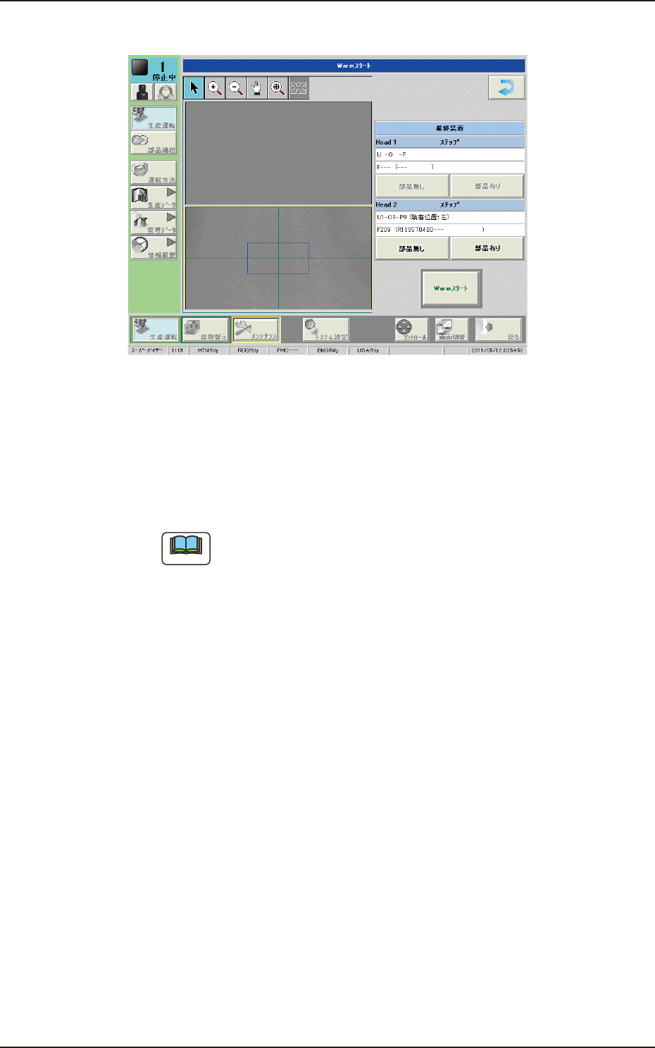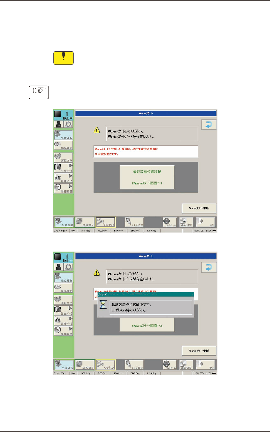 1OM-1750 3-49 5.3 ウォームスタートでの生産再開 ウォームスタートをすることにより、装置が停止したステップから生産を 開始でき、不良基板を作らずに生産を再開することが可能です。 注 意 ウォームスタートを中断した場合、現在生産中の基板に未実装が生じる おそれがあります。 ウォームスタートでの生産再開を推奨します。 手順 (1) [ 最終装着位置移動 ] ボタンを押す。 F1C41 F1C42 1302-001 5.3 ウ…