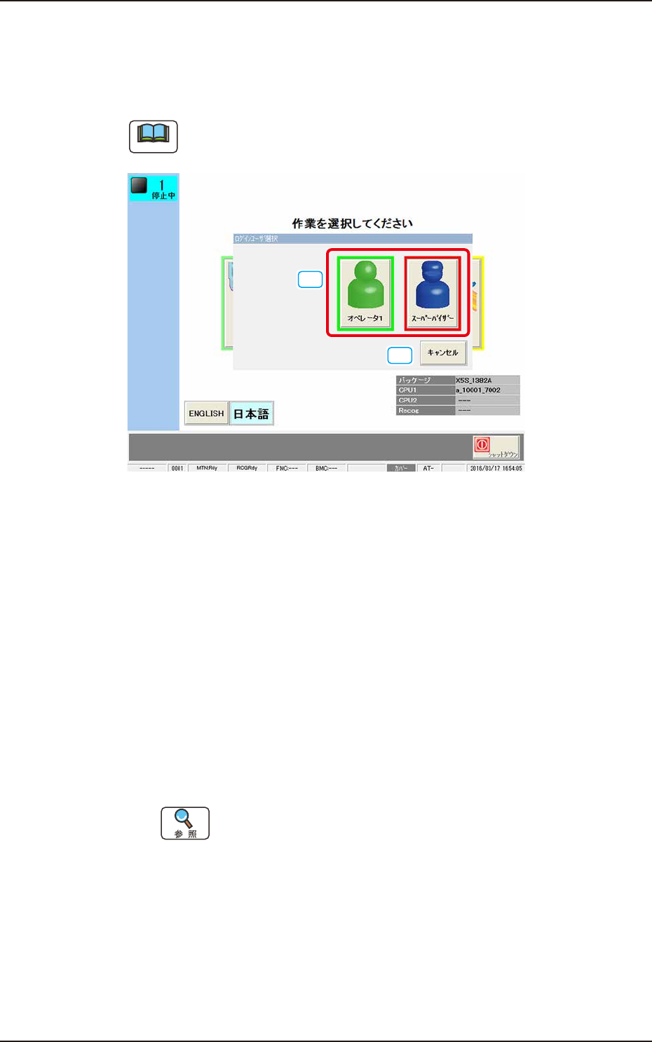 (1) [ オペレータ 1]、 [ オペレータ 2]、[ スーパーバイザー ]、のログイ