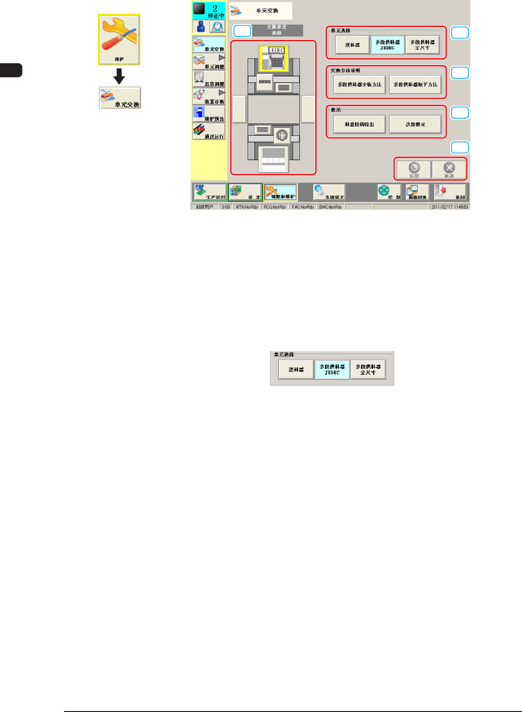 7OM-1602 3-2 第三章 1. 维护菜单 1 103-003 1.2 单元交换 [1] [2] [3] [4] [5] “ 单元交换 ” 界面 F7C2 [1] 单元图像 显示当前选择单元的图像。 [2] 单元选择 选择交换送料器。 根据选择的单元,切换不同显示。 选择多段供料器 JEDEC 时 F7C3 界面展开
