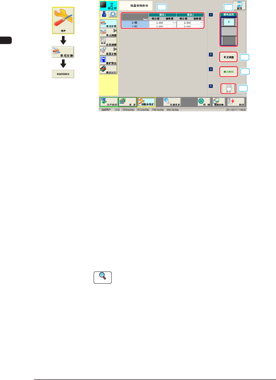设在升降机单元背面侧的水准器 2 处气泡须静止在中央红圈内。