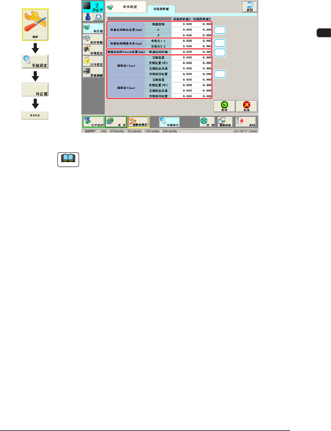 对准移动向储料箱 1 送回托盘的段时,输入的补正值反映到升降机轴