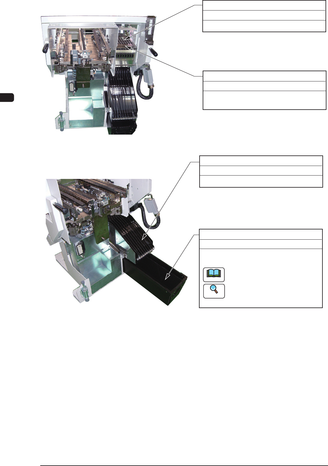 7OM-1602 第四章 3. 维护保养部位 4-21 • 料盘拉钩保护盖的拆卸 Procedure (1) 将多段供料器复位到原点。 (2) 切断电源。 (3) 用十字螺丝刀拧下固定螺丝钉 (M3L4)(2 处 )。 警告 进行维护保养作业时,请拉下电闸后锁上挂锁。 料盘拉钩保护盖 F7D14 • 维护保养盖的安装 请按照与拆卸料盘拉钩保护盖的相反步骤安装维护保养盖。 注意 结束维护保养后,请安装机盖。 1201-004