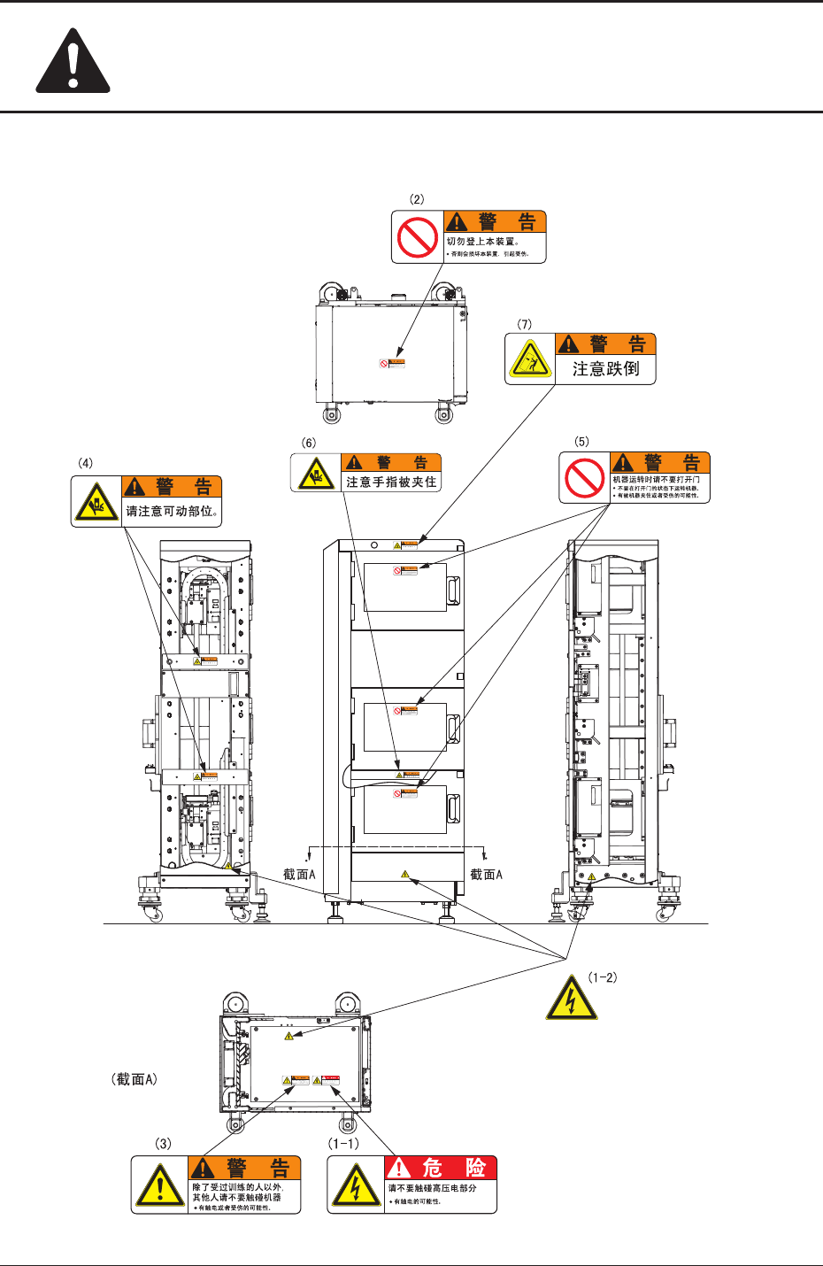 请点检此类警告标签,要注意常进行清扫,以便让人可以从安全距离看清楚内容。