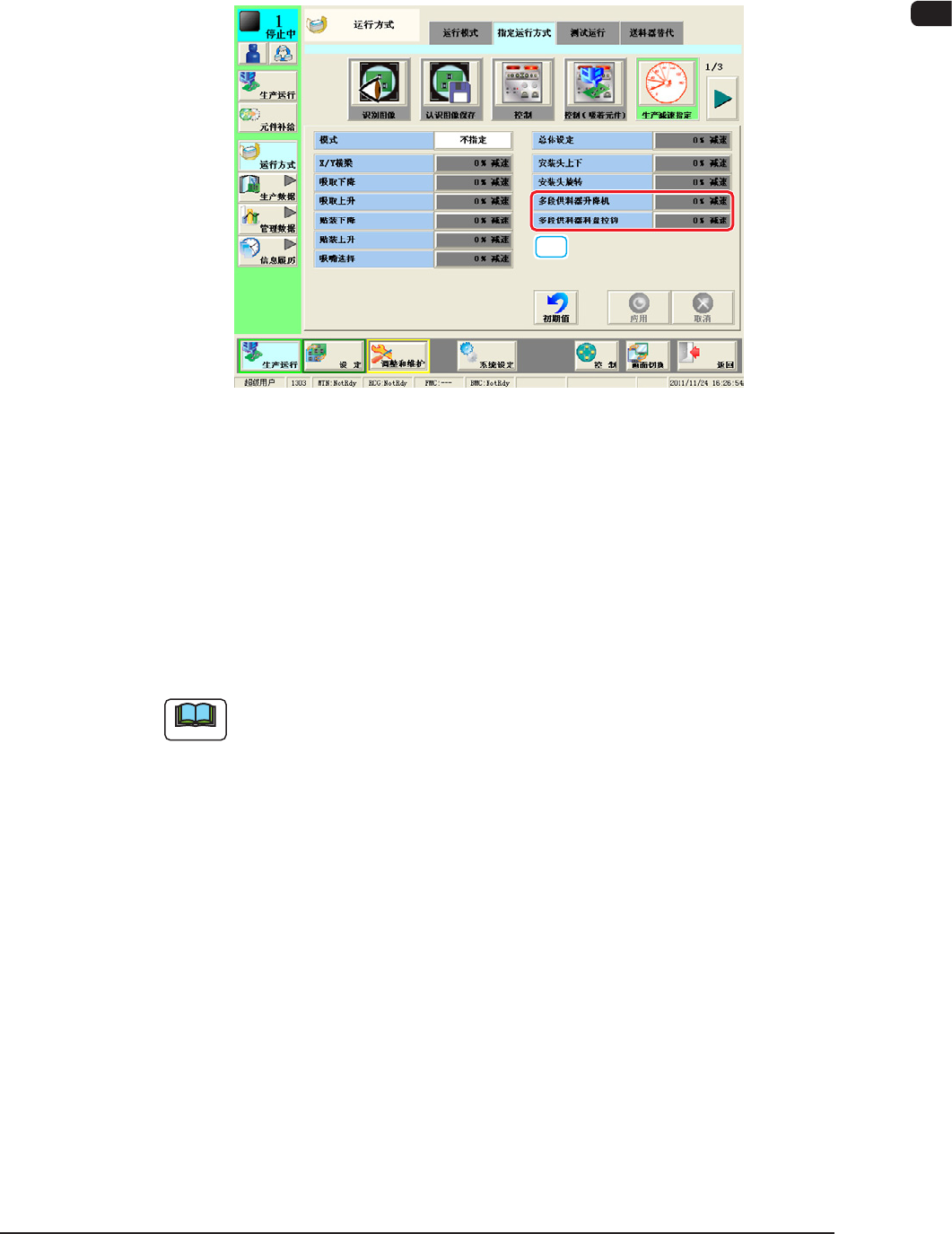 7OM-1602 2-8 第二章 2. 生产运行菜单 2.3 运行方式 在 “ 运行方式 ” 界面中,按 [ 指定运行方式 ]Tab,便显示以下界面。 “ 运行方式 ” 界面 F7B9 “ 运行方式 ” 界面由 “ 运行模式 ” 界面、 “ 指定运行方式 ” 界面、 “ 测试 运行 ” 界面、 “ 送料器替代 ” 界面构成。 可以对多段供料器升降机、多段供料器料盘拉钩的运行速度减速指定 进行设定。 1 103-003 界面展开