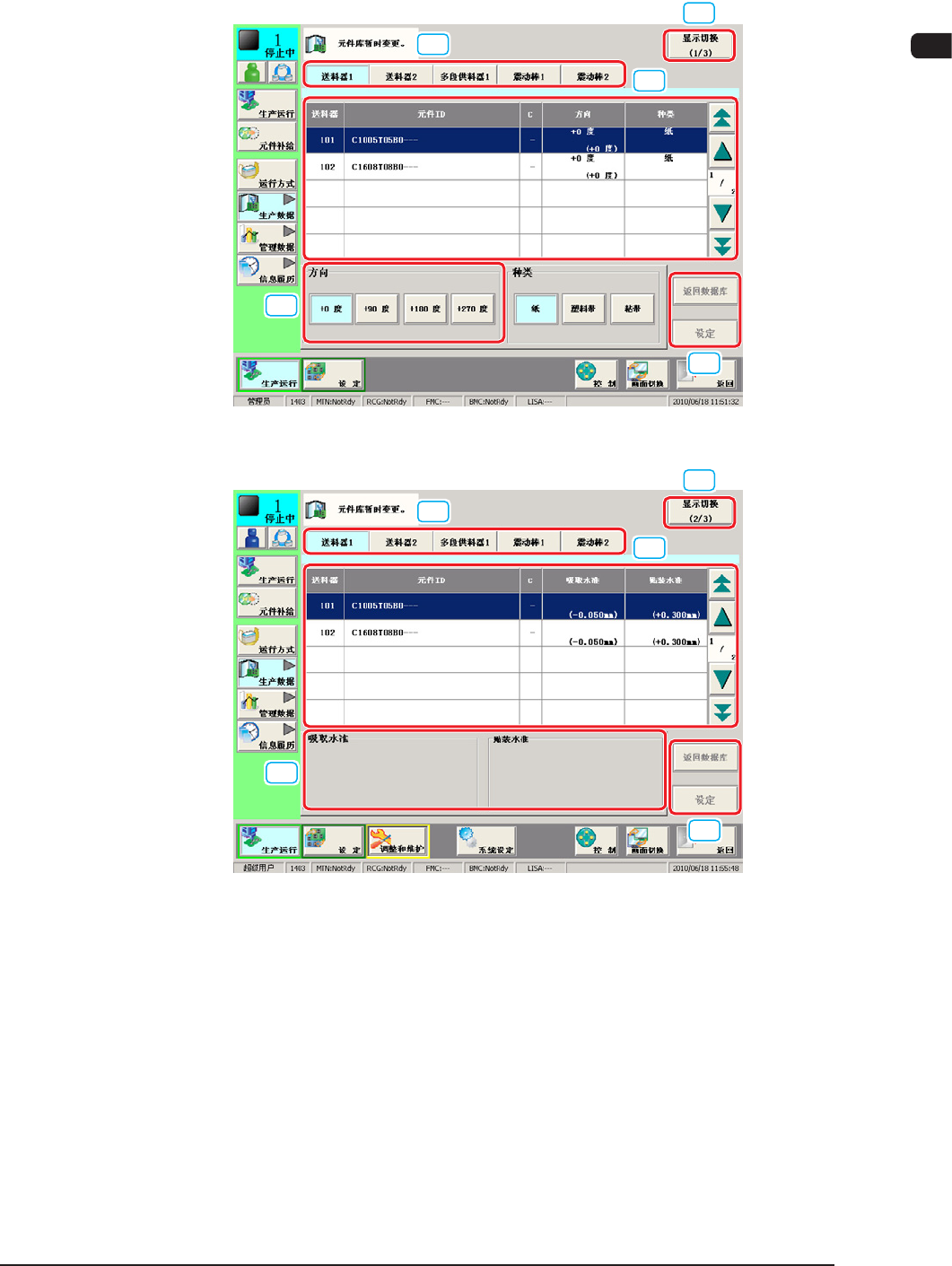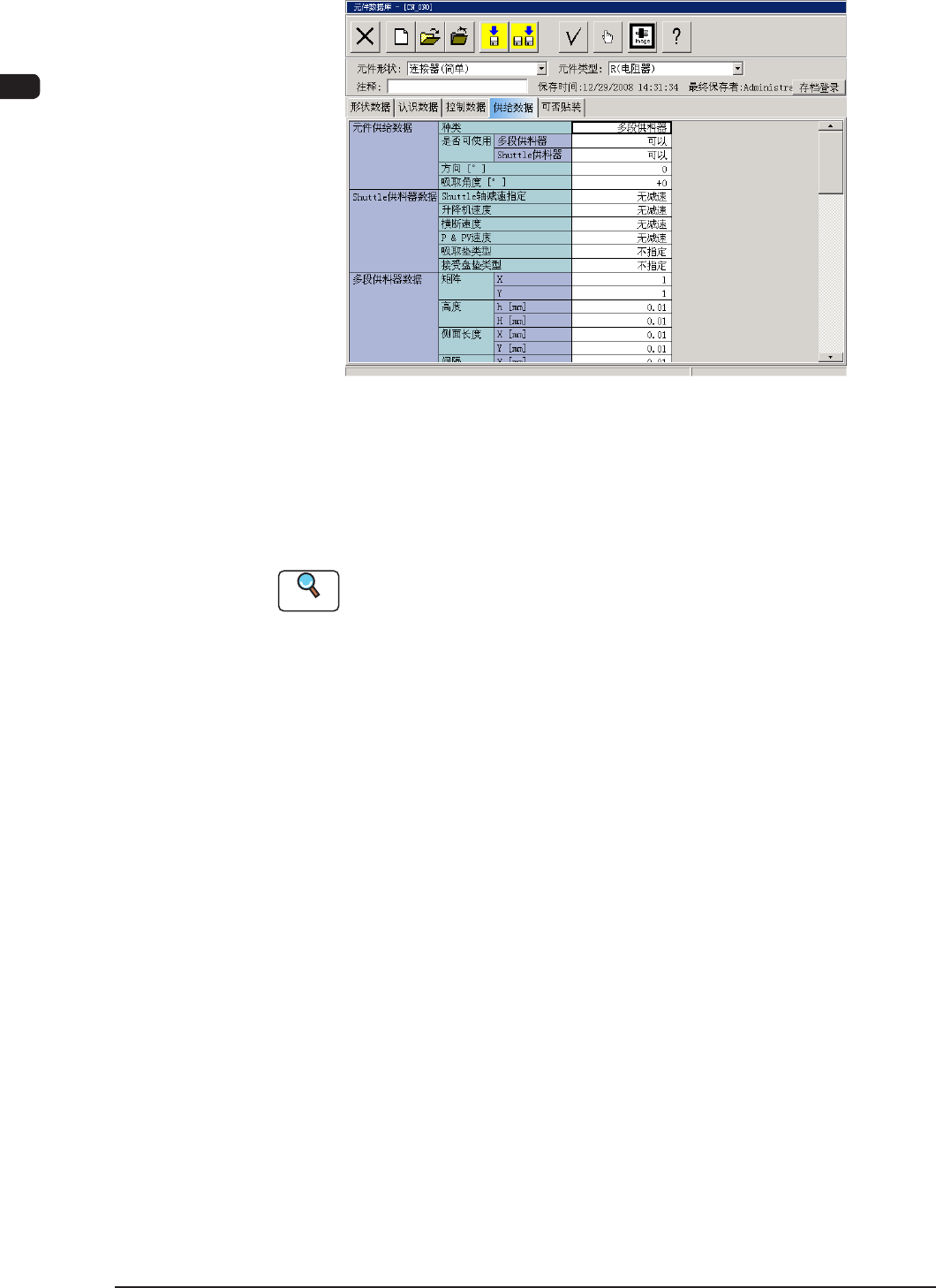7OM-1602 2-24 第二章 2. 生产运行菜单 2.4.5 元件数据库 “ 供给数据 ” 选项卡 F7B20 供给数据 该选项卡对应于所有元件形状 “ 圆筒、方形、异形、IC( 简单 )、 IC( 复杂 )、连接器 ( 简单 )、连接器 ( 复杂 )、其他带引脚 ( 简单 )、其他 带引脚 ( 复杂 )、BGA/CSP ” 。 Reference 各数据的详细内容请参照 “ 第六卷 第二章 1.5 供给数据 ” 章节。 请在元件…