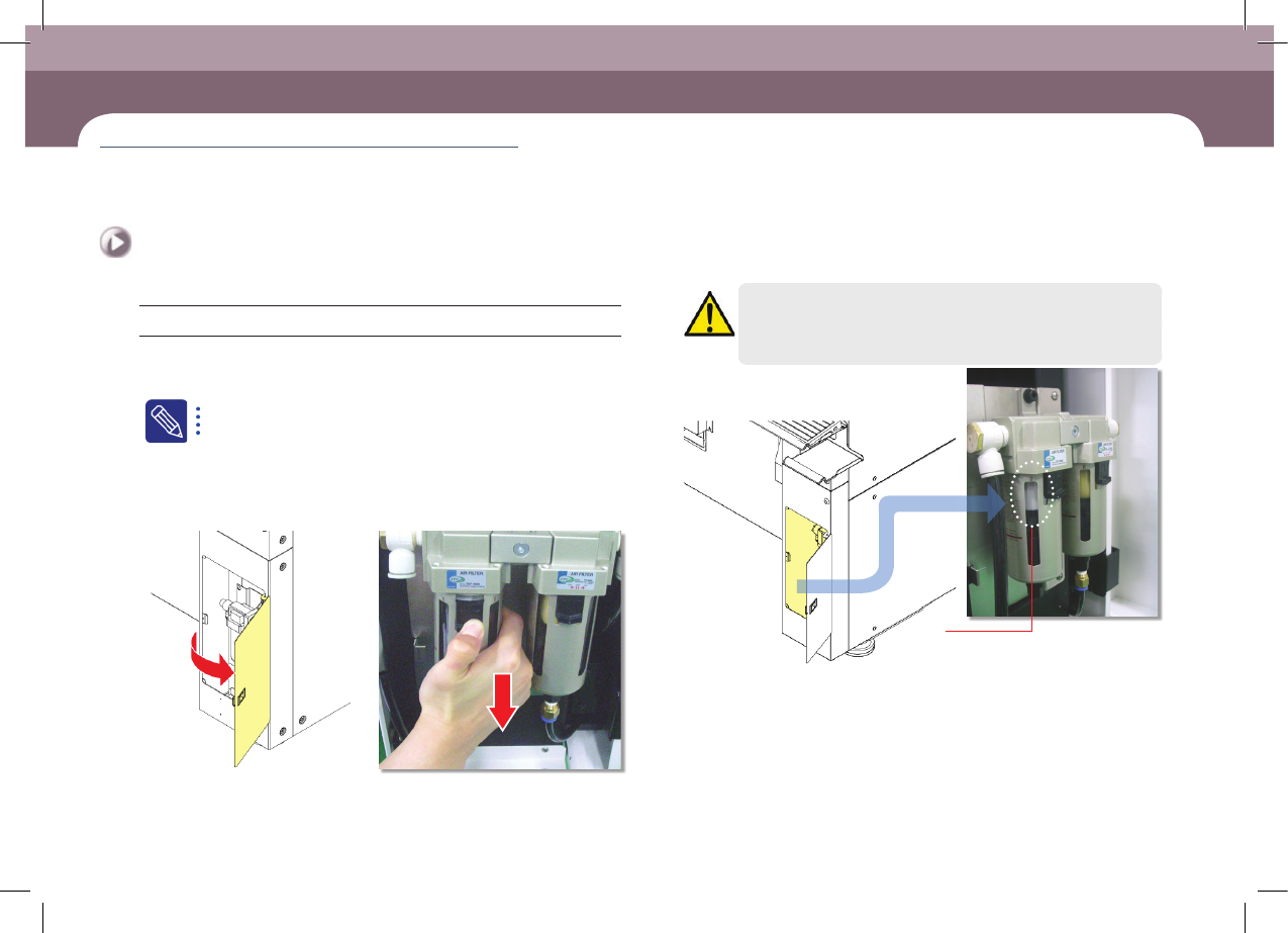 DE CAN S2 Mai nte nan ce Ha ndb oo k 3-11 제 3 장 일일 점검 Advanced Chip Shooter Air Filter 점검 및 교환 공기 속의 먼지를 제거함으로써 공압 사용 시 이물질로 인한 장비 오류를 방지 조치 Step 1. OP패널 의 'E MG' 버 튼을 눌러서 작 업 을 정지 후 ' STOP ' , '…