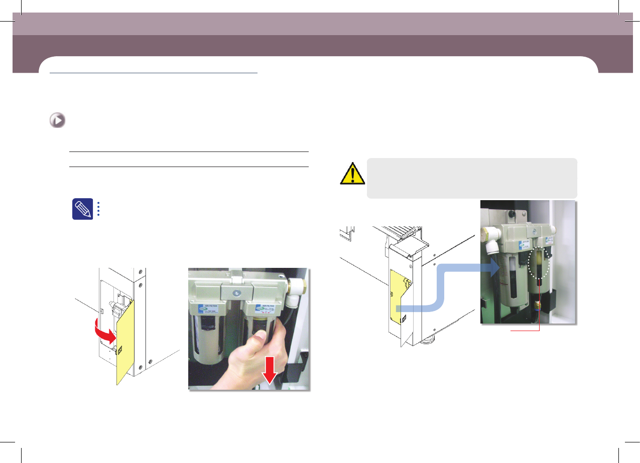 DE CAN S2 Mai nte nan ce Ha ndb oo k 3-1 4 제 3 장 일일 점검 Advanced Chip Shooter Mist Separator Filter 점검 및 교환 일일 점검 Step 4. 시계 반 대 방향으로 돌 려 용 기를 분 리 Step 5. Filte r를 시계 방 향 으로 돌 려 분 리하여 교체 Step 6. ""3 . 비상 정지 해제하 …