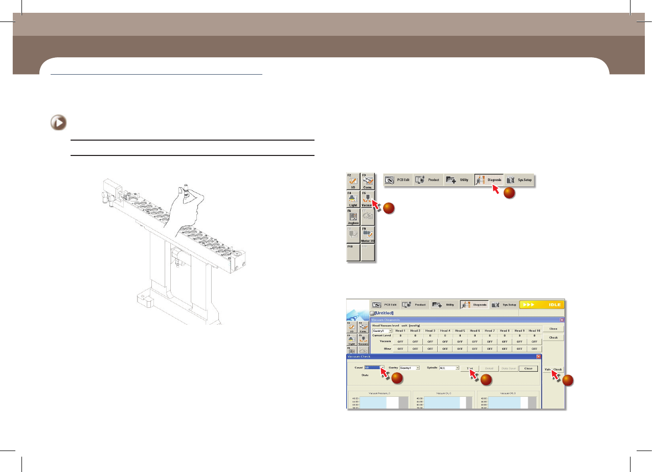 주간 점검 제 4 장 Advanced Chip Shooter DE CAN S2 Mai nte nan ce Ha ndb oo k 4-3 Solenoid V alve 점검 조치 Step 1. AN C에 CN04 0 Nozzle을 삽입 Step 2. 장비를 작동시 켜 AN C의 CN04 0 Nozzle을 He ad에 장착 Step 3. MM I의 ' Diagn osis'메 뉴를 …