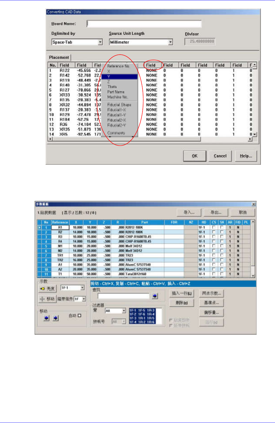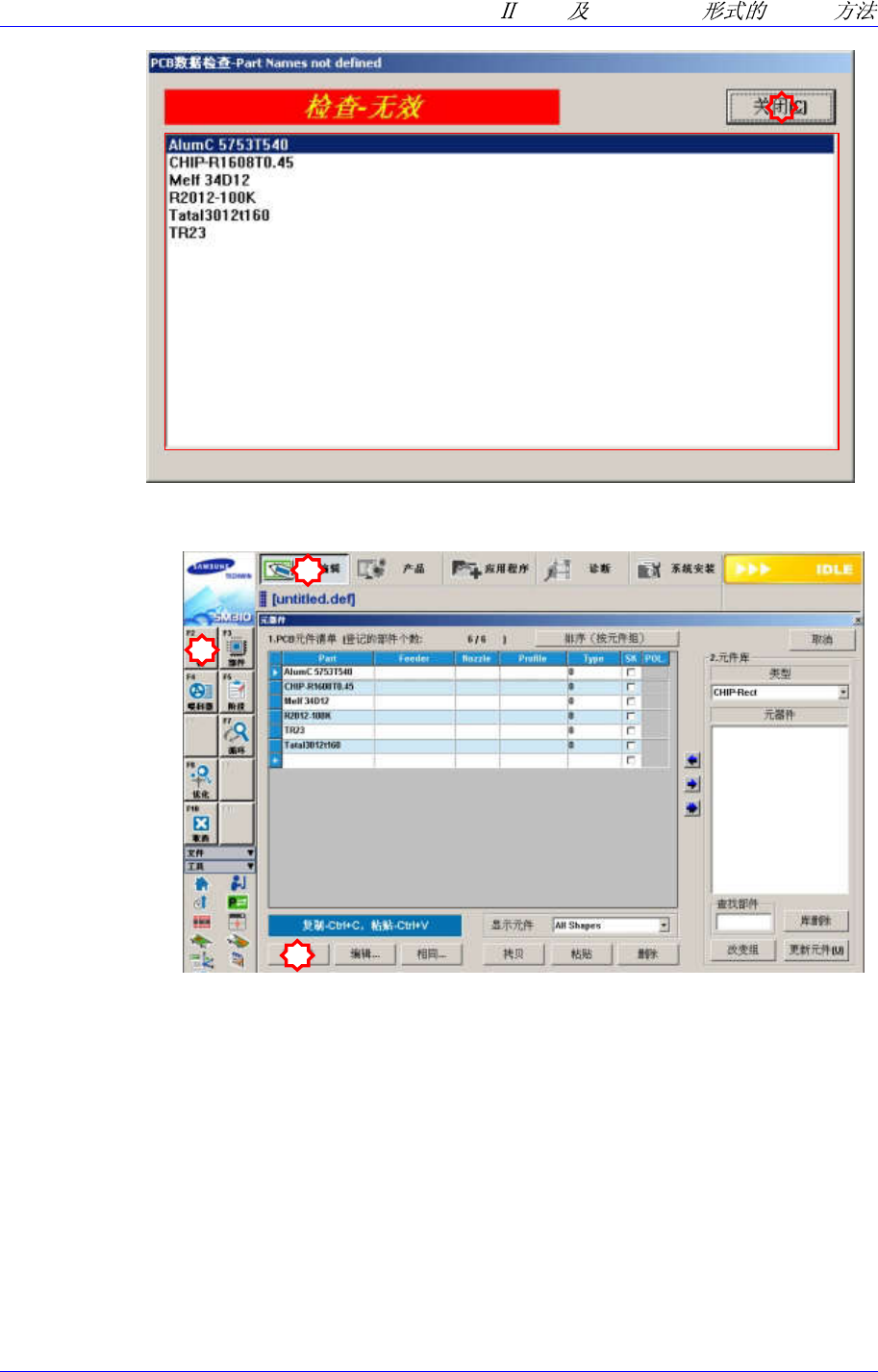 Samsung Component Pla cer SM310 Pr ogramming T utorial 3.3.2.2. Import 导入之后 下面是 I mport 完成后的屏幕。 如果从 CAD 数据 Import 的元件没有登记,需 要将未登记元件予以登记。 导入完成后主画 面下端显示 <Undefined Data – Part Names not definned > 对话 框。对话框的右侧显示 未登…