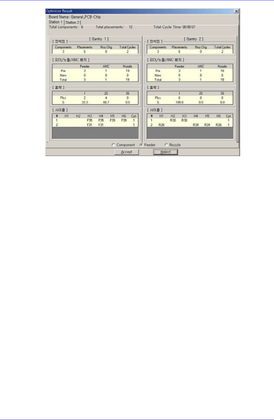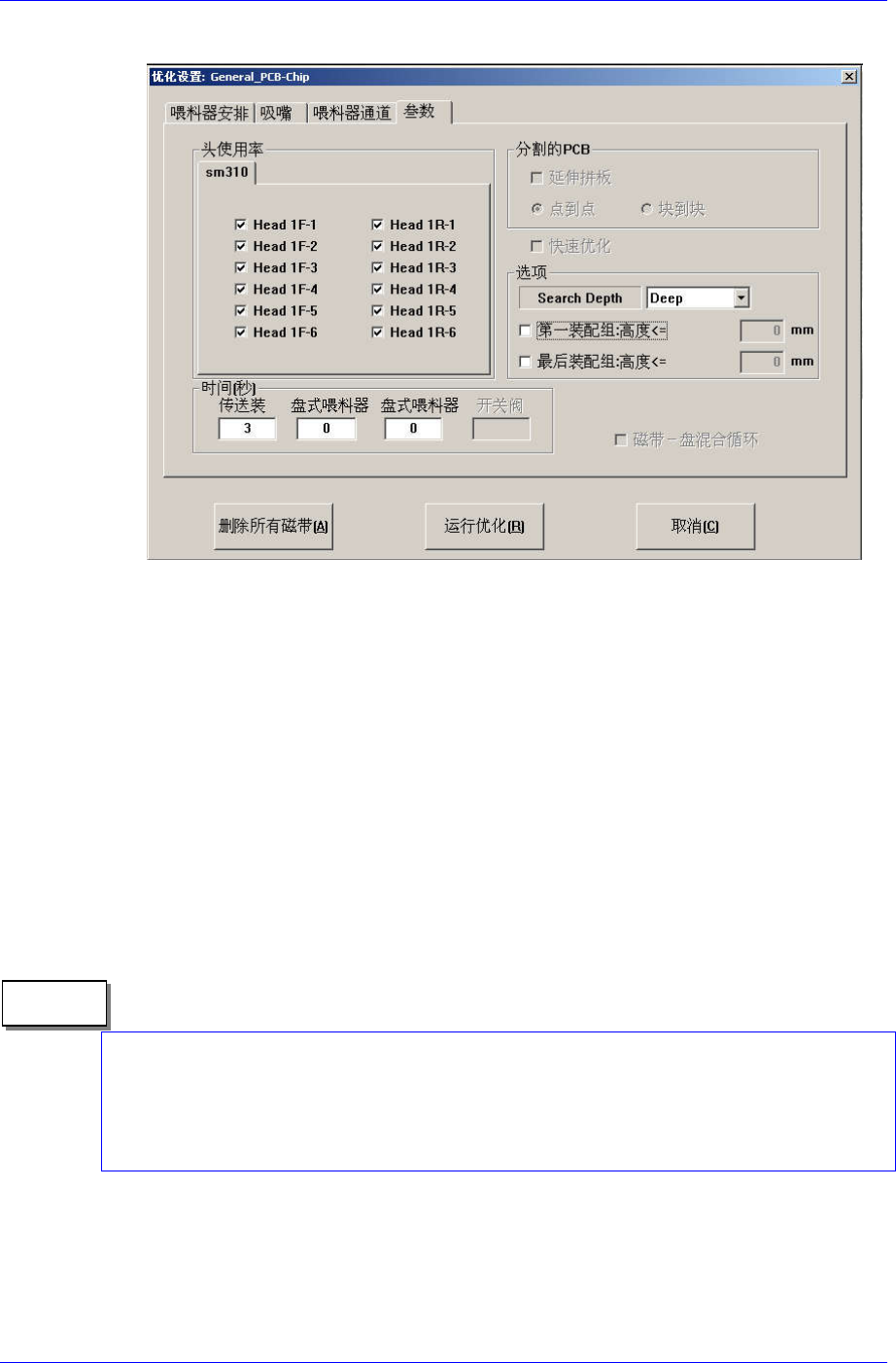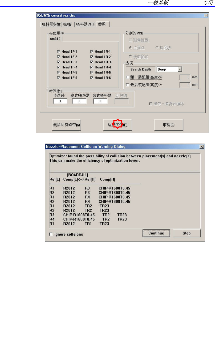 Pr ogram(C hip ) 1-35 按 < 运行优化 > 按钮时执行优化,执 行中会出现下面的对话框 。 <Ignore collisions> 检查框 校验校验盒时 ,忽略部件贴装时已贴 装的部件与吸嘴可 能发生的碰撞, 按设定的工作顺序执行 部件贴装。 <Continue> 按钮 执行最优化 (Optimizer) 。 <Stop> 按钮 中断 <…