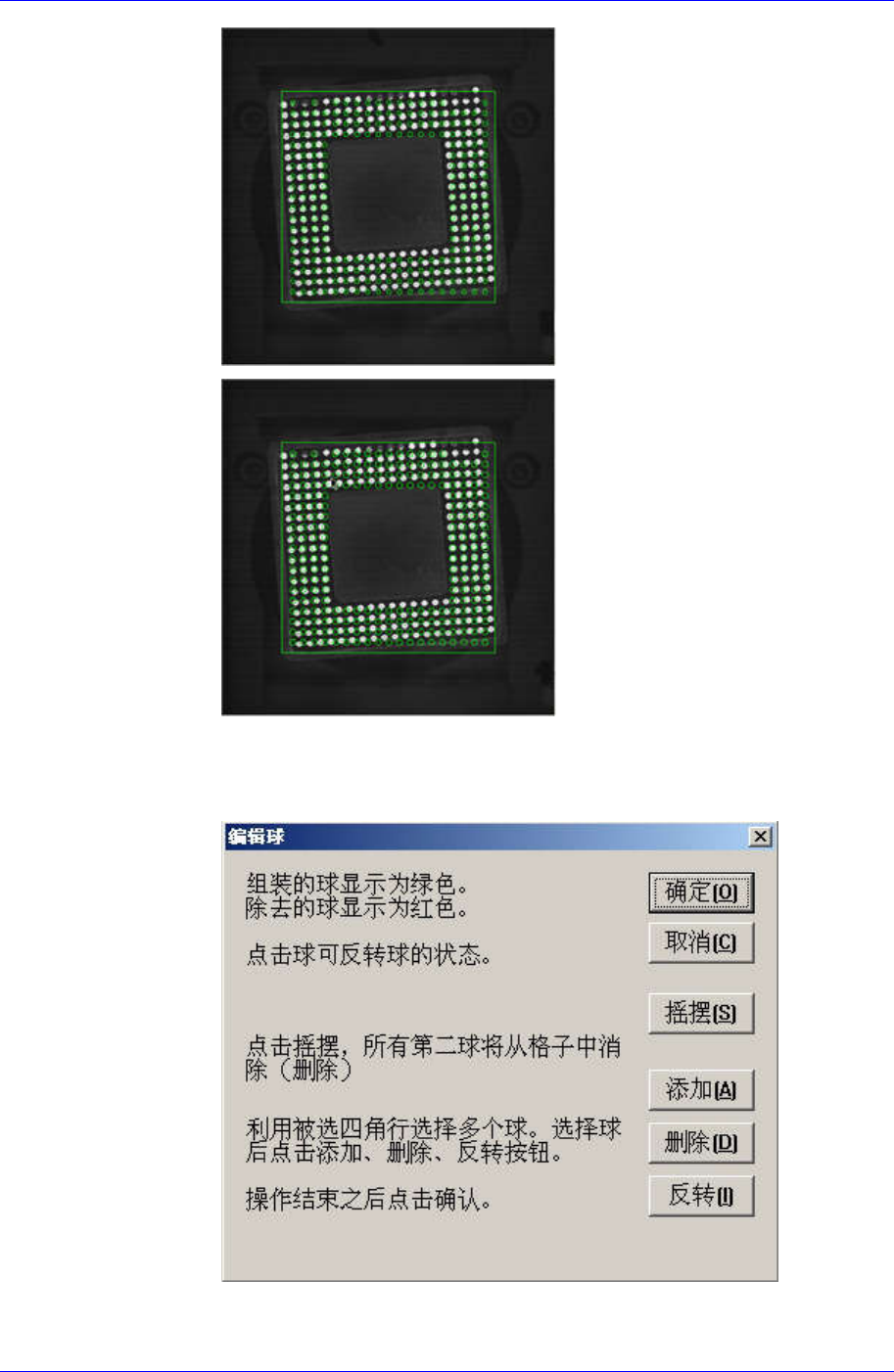 Samsung Component Pla cer SM310 Pr ogramming T utorial ( 两个图像不一致 ) ( 两形象一致 ) 单 击 < 编 辑 球 ..> 按 扭 则 LSO V ideo 画面 球 形 变 成 绿 色 。 绿 色 执 行 球 检 查,红 色 不执行 球检 查。 万一 显示 中间 有漏 洞的 形象 ,利用 < 摇 摆 > 或 < 删除 > 按扭,使球色变为…