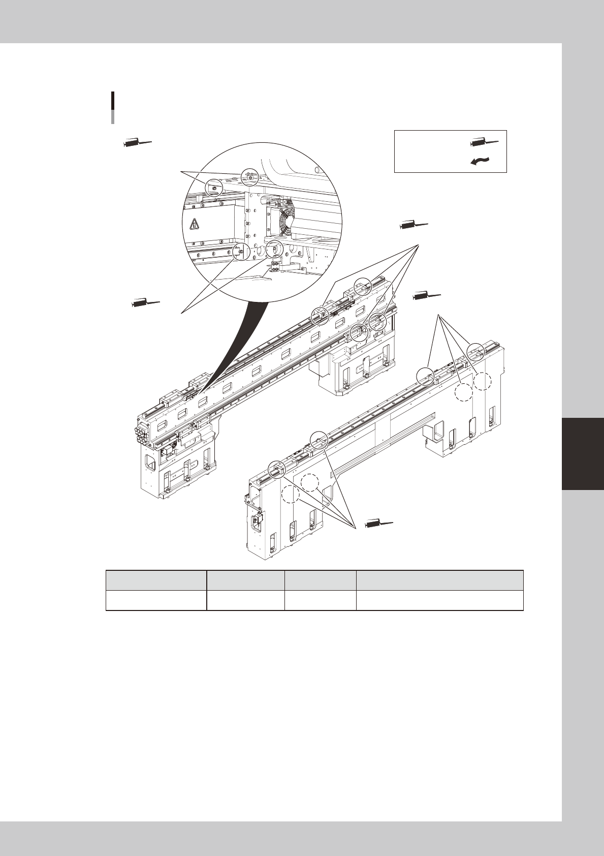 5-4 5 Lubrication points and schedule 2.2 Y -axis 2.2.1 4-beam type Y -axis lubrication points Guide Grease gun: Manual lubrication: Y -axis guide (D-table) Y -axis guide (C-table) Y -axis guide (B-table) Y -axis guide (…