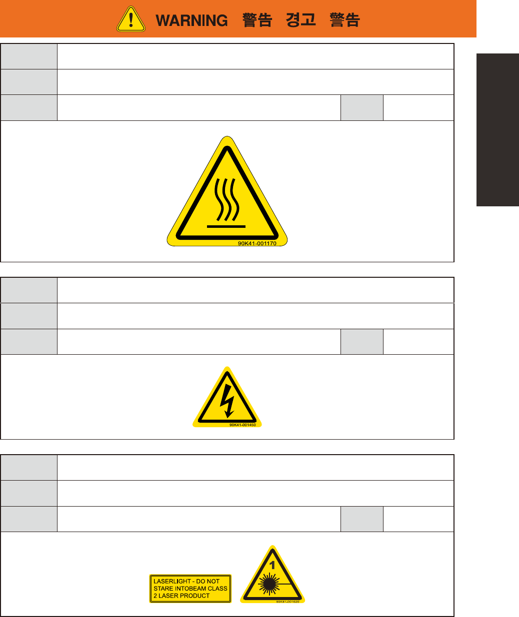 xv Safety instructions Potential hazard Burn hazard T o avoid hazard Heater becomes very hot during and shortly after operation, so do not touch it. Applicable machines YSH20 machines equipped with heater (option) Case •…