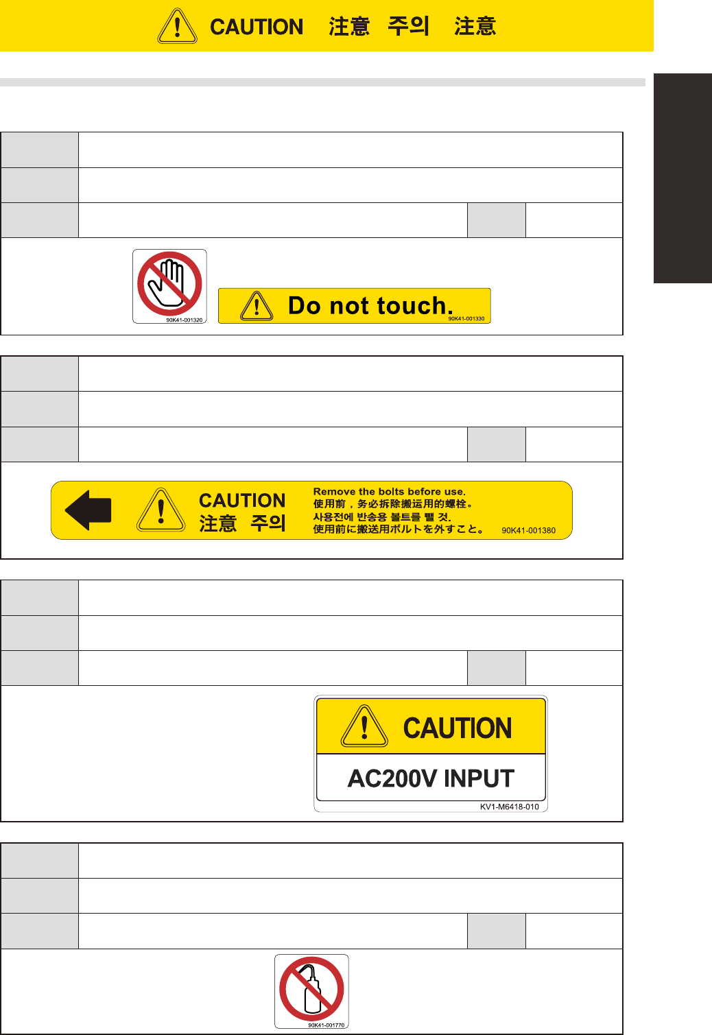xix Safety instructions 3.3 Caution labels 3.3.1 Machine damage Potential hazard Adverse effects on component mounting accuracy T o avoid hazard Do not touch camera unit or apply impacts to it. Applicable machines All ma…