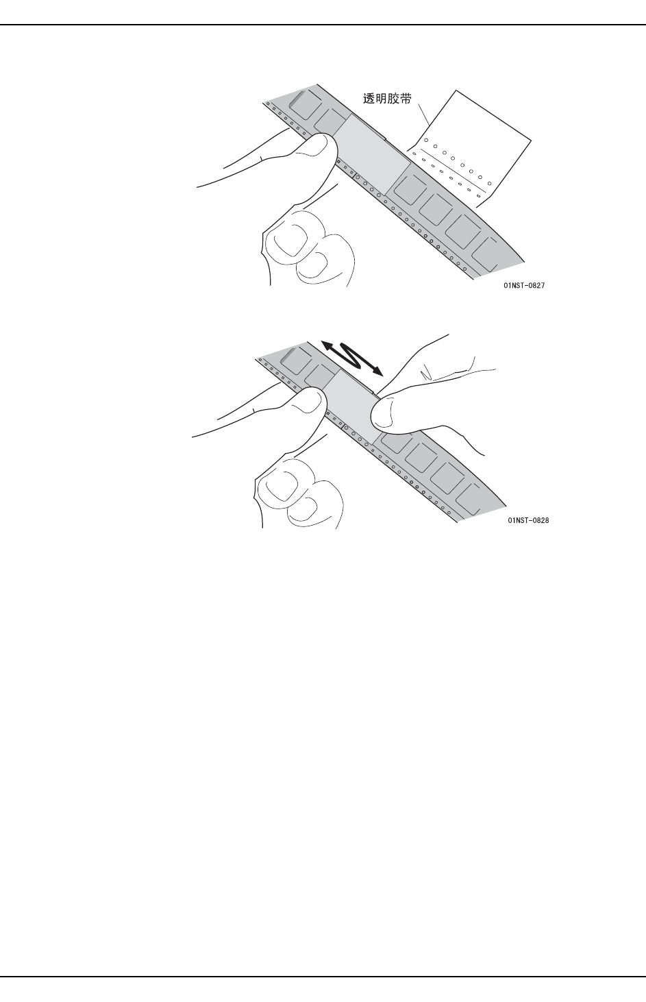 4. 折返透明的拼接胶带,使得治具上的销嵌入胶带孔内。按压胶带粘贴处,使得胶带牢固