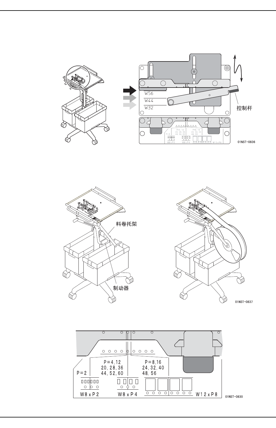 1. 操作料带拼接作业推车上的控制杆,将从属送料孔料带拼接部的位置调整到相应的位
