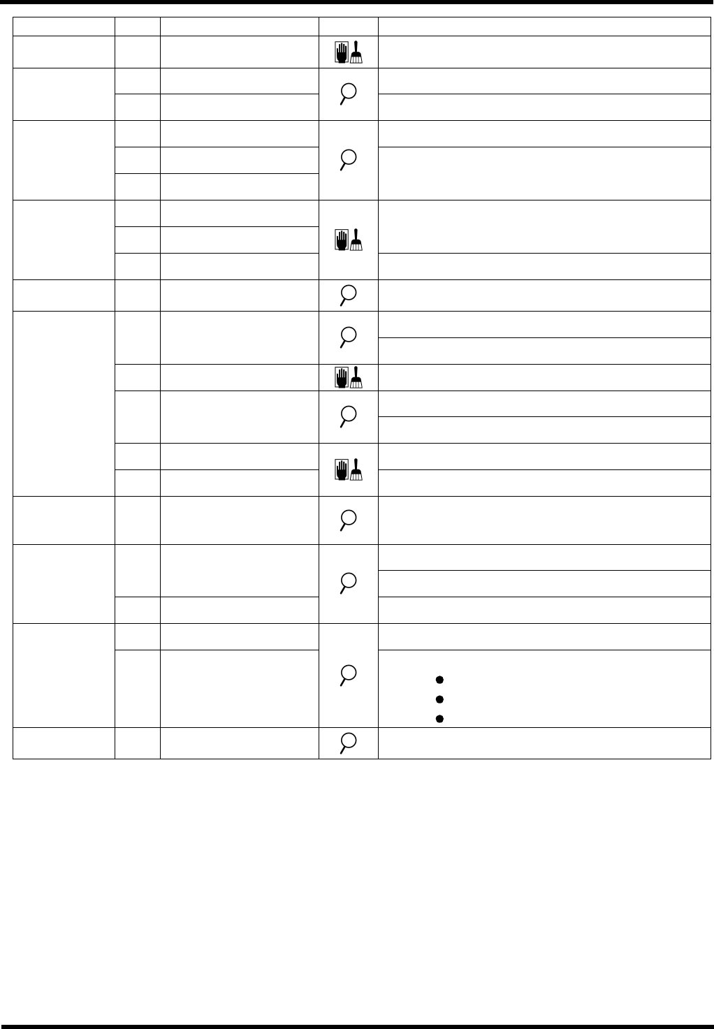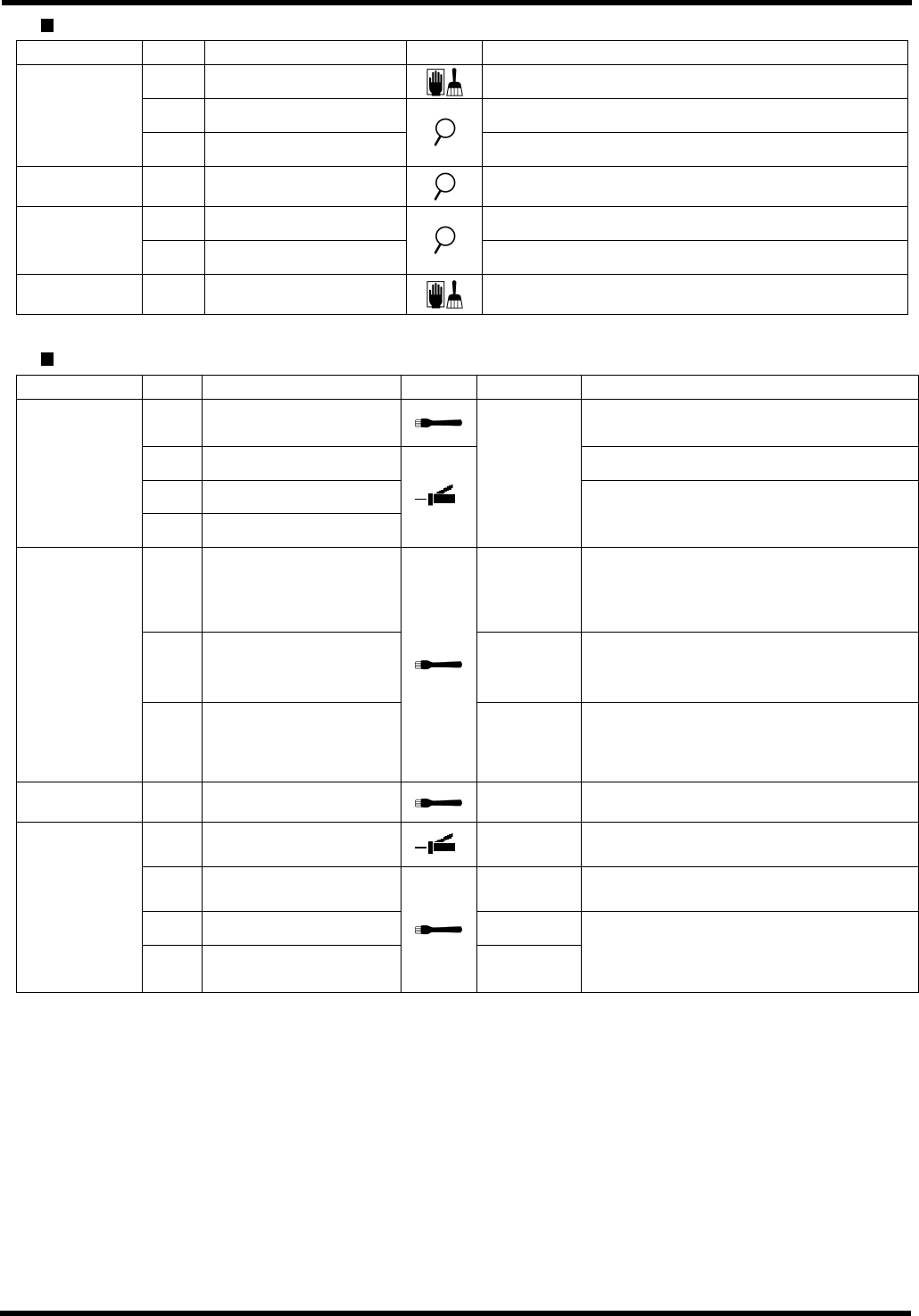 AVK3 维修手册 6.2 检查和润滑 D77MCC-80-020- A0 6.2-4 单元 编号 项目 工作 描述 6.2.11 供料器 d. 滚珠丝杠轴 清除异物或灰尘。 b. 凸轮扣紧螺栓 确保凸轮扣紧螺栓不会松动。 6.2.12 主单元 c. 蜗轮减速器 确保润滑剂不会从蜗轮减速器漏出。 d. 板凸轮紧固螺栓 确保板凸轮紧固螺栓不松动。 e. 凸缘和较低砧座 6.2.13 下砧座 f. 凸轮从动件 确保这些装置移动平稳。 c. …