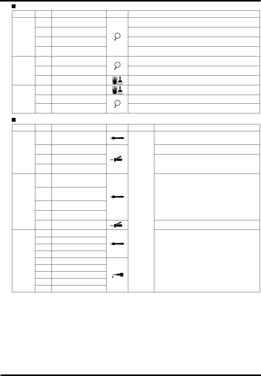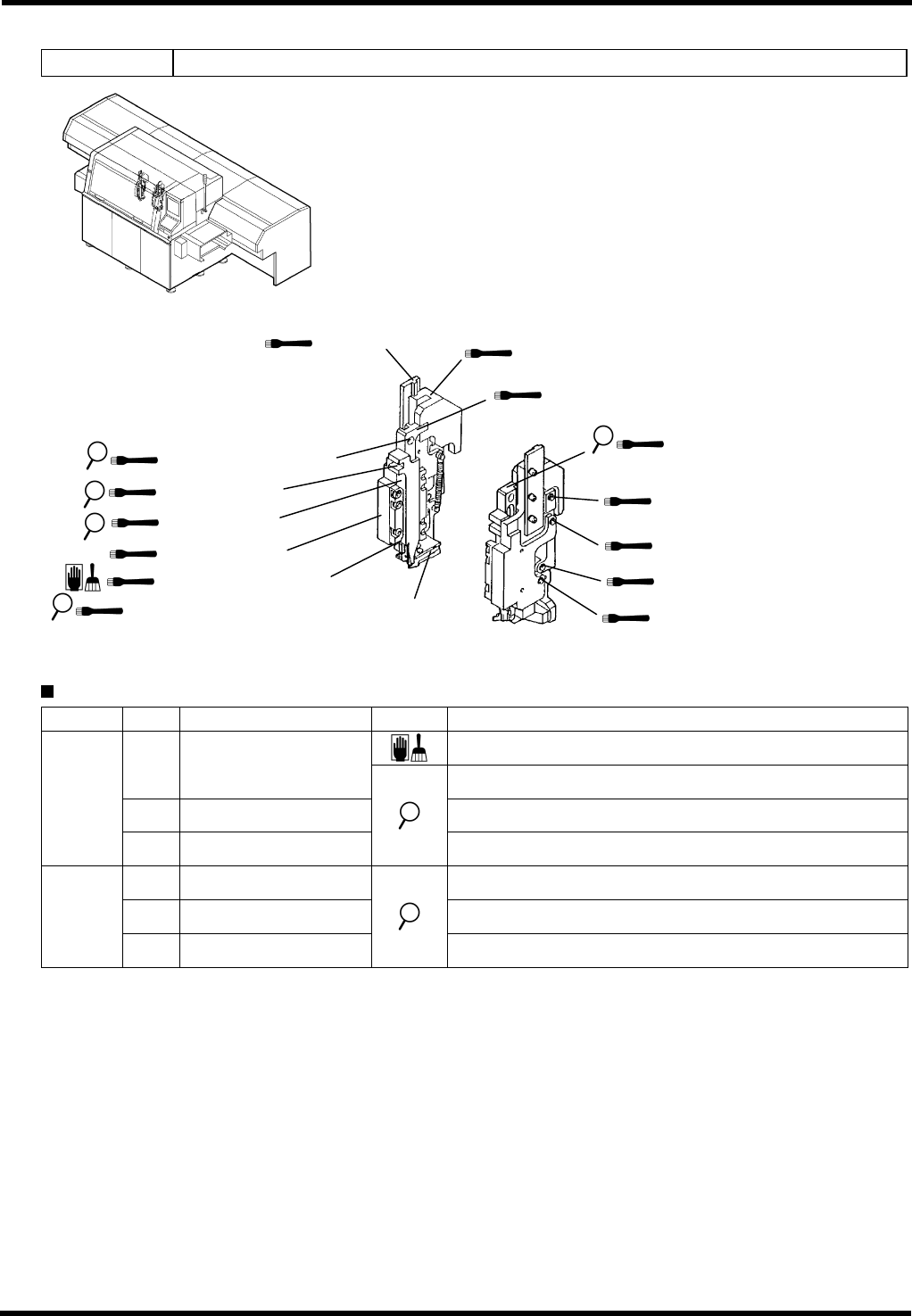 AVK3 维修手册 6.2 检查和润滑 D77MCC-80-020- A0 6.2-15 6.2.8 插入单元 装置编号: 1087110000 检查 周期 编号 项目 工作 描述 清除异物或灰尘。 a. 切刀刀片 确保切刀刀片没有磨损或损坏。 b. 插入导杆 确保插入导杆没有磨损或损坏。 每天 c. 折弯模具 确保折弯模具的顶部没有磨损或损坏。 d. 滑动单元 确保滑动单元滑动平稳。 e. 推进器 确保推进器移动平稳。 每周 f. 控…