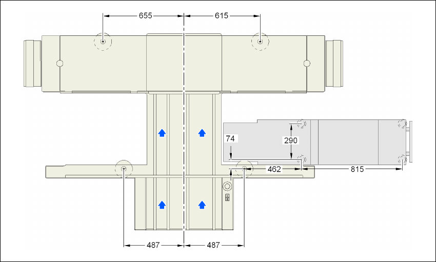 Kuva 4.3 - 4 Koneen jalkojen ja PL-kaksoiskuljettimen kiinteän oikean ja vasemman kuljetinreunan etäisyysmitat milli-