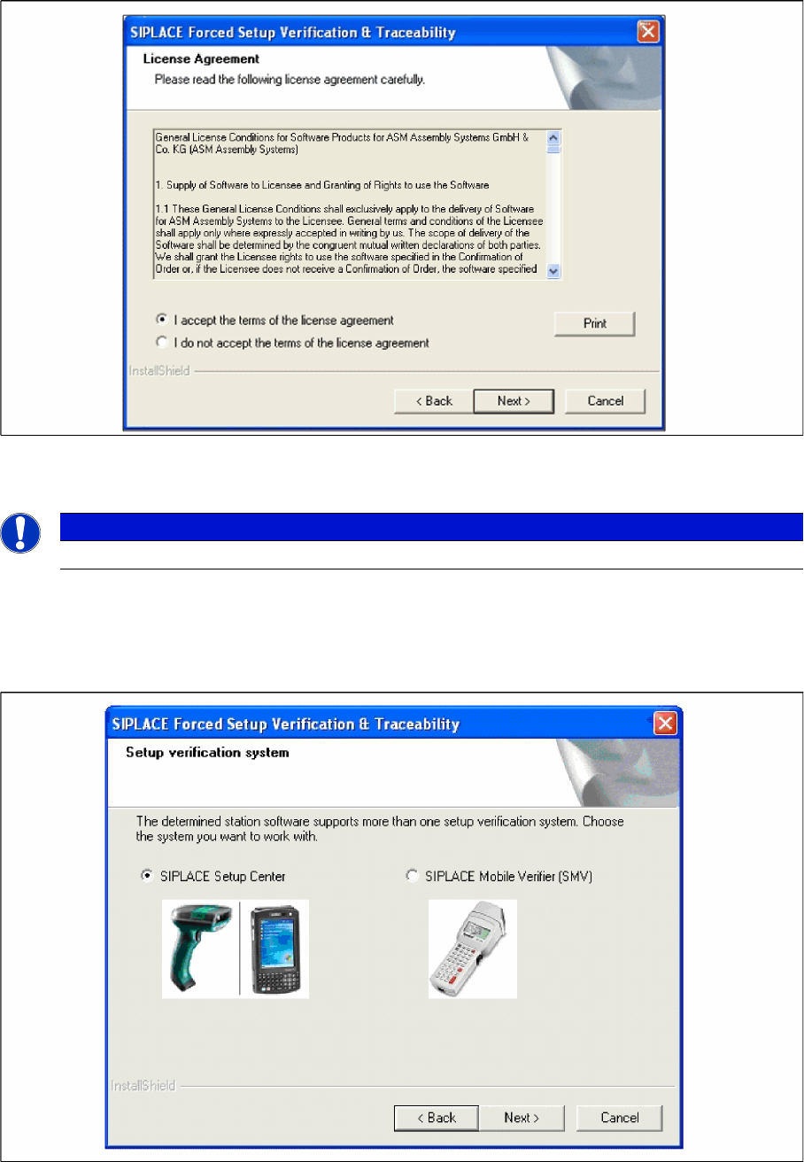 Installation Software Installation Setup Center 72 Installation Manual SIPLACE Setup Center 5.1 Step 3 Licence dialog ► Read the license agreement. If yo u agree with the conditio ns, c lick I accept ... , otherwise clic…