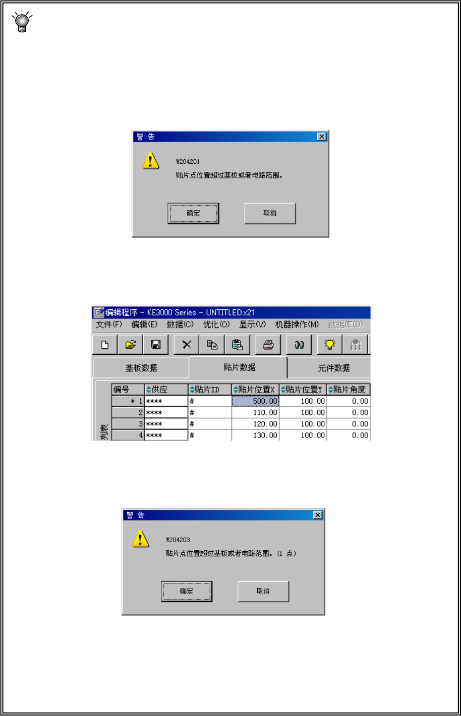 在输入贴片位置 X 或 Y 时,或分别进行了改变时,将进行范围检查。