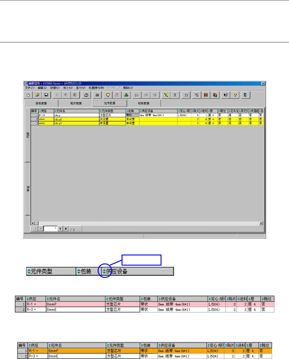 EPU 使用说明书 第 4 章 制作生产程序 4- 48 4-1- 4 元件数据 「元件数据」 ,是针对在 「贴片数据 」 中输入的 “ 元件名称 ” 输入详细的信 息数据。 因此,凡是在「 贴片数据」中输 入的元件名称 ,必须制作出相 同数量的对应 数据。 4-1-4- 1 元件数据画面的显示 元件数据的显示 画面,有表格显 示和列表显示 2 种形式。 列表显示画面, 是以列表形式显 示多个元件数 据的概要。 在此不能输入数 据,只可…