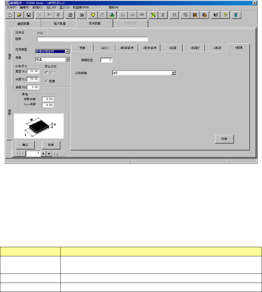 EPU 使用说明书 第 4 章 制作生产程序 4- 108 ( 3 )元件类型 外形识别元件 时 支持外形识别 的元件为接近长 方形或正方形 的元件。 构成其外形的 边缘必须在 0.3 mm 以上 。 1) 明暗校正 设置外形识别元 件 识别时的临 界值 ( 阈值 ) 。 初始值设为 “ 0” ,未能正 常进行识别 时,请在 “- 12 7 ~ 127” 之间进行 调整。 请进行调整: 元件发暗而导致识 别错误时, 请降低 数值 ( 将…