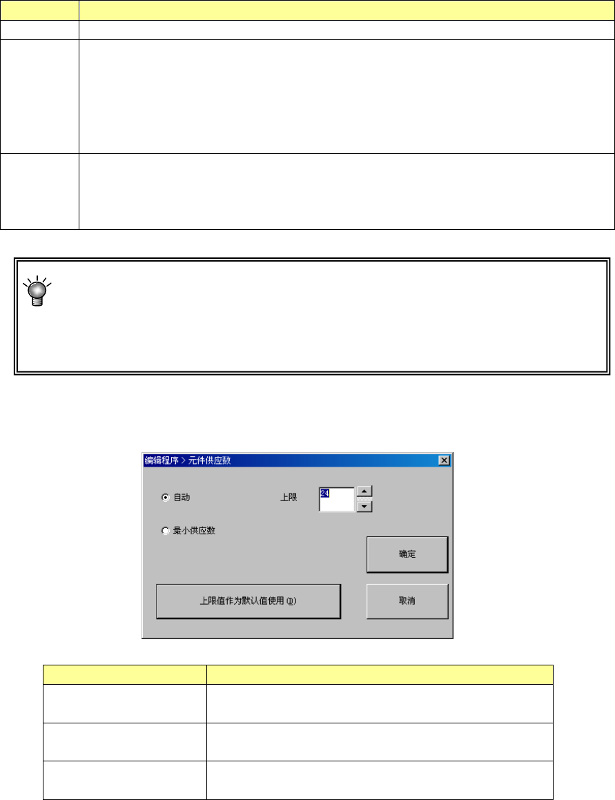 EPU 使用说明书 第 4 章 制作生产程序 4- 128 (2 ) [ 变更 ] 按钮 对各元件的供料 器 供应数进行 设置 。 设置项目 内 容 自动 对指定的元件的 供应数设置为自 动。 在初始化中设置 的上限内进行供 料器数的优化 。 可无限使用元件 的卷数托盘数。 手动 手动变 更供应数。 按所设置的供应 数进行供料器或 托盘配置的优 化。 输入供应数 未使用 使成为供 应数为 0 的状态。 优化时,对指定 的元件不使用该 类…