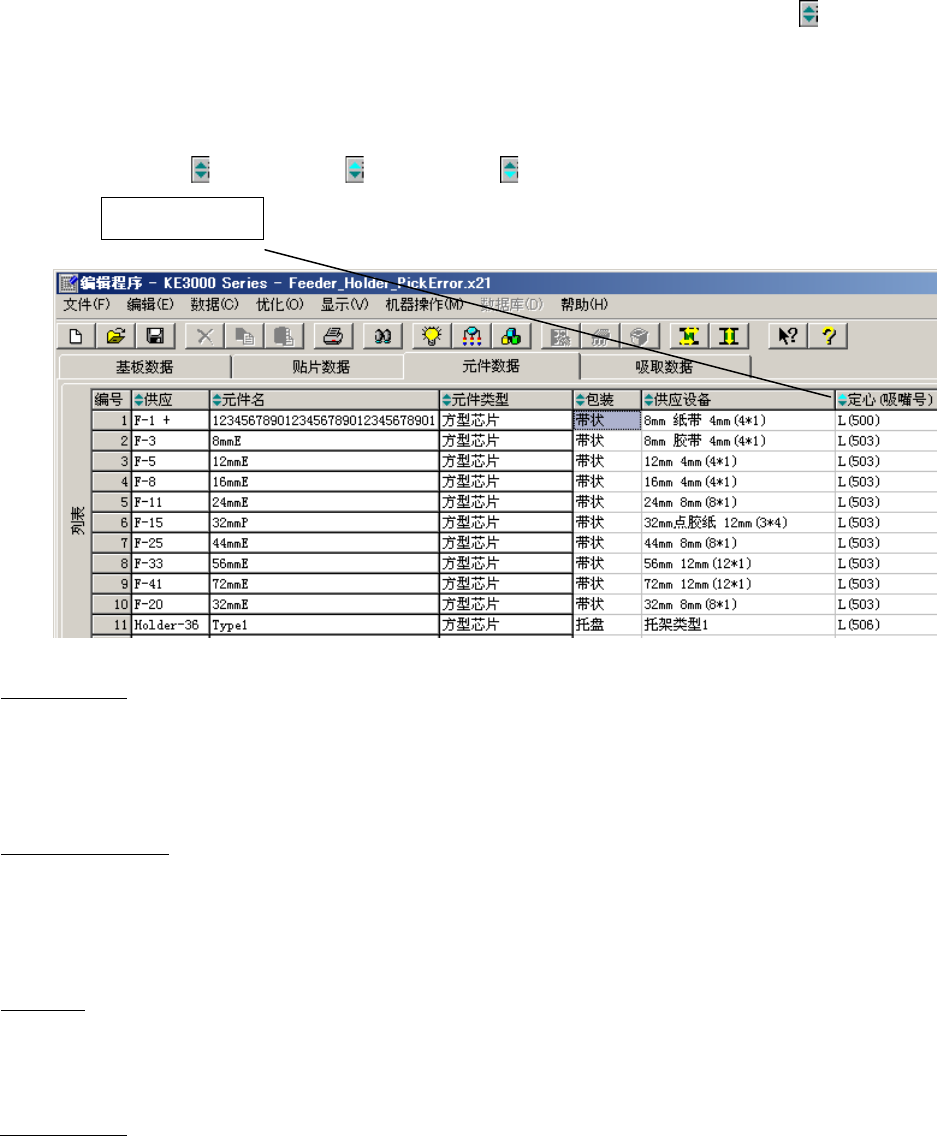 元件名称、包装状态、供给设备、供给(号码)均可做为排序关键字,使之显示出排序数据。