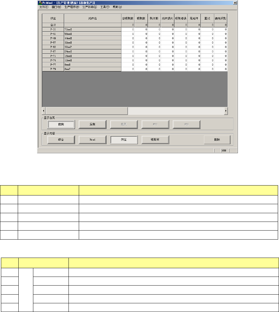 EPU 使用说明书 第 4 章 制作生产程序 4- 176 No 项目 内容 1 Hea d 显示该 Head 的号码。 2 总吸取数 使用该 H ead 吸取的次数。 (吸取数 + 吸取错误) 3 吸取数 该 Head 吸取成功的元 件数。 4 贴片数 该 Head 吸取贴片的元 件数。 5 元件损失 该 Head 损失的元件数 。 (吸取总次数- 贴片数) 6 吸取错误 该 Head 吸取失败的次 数。 7 元件掉落 显示吸取元件后…