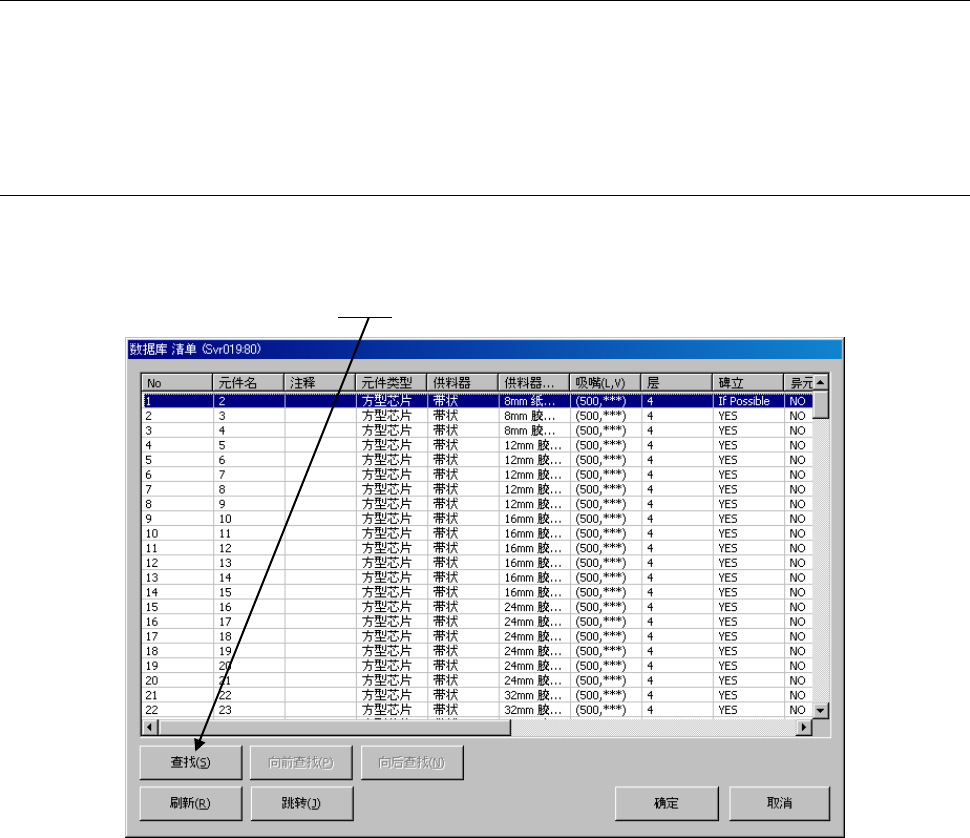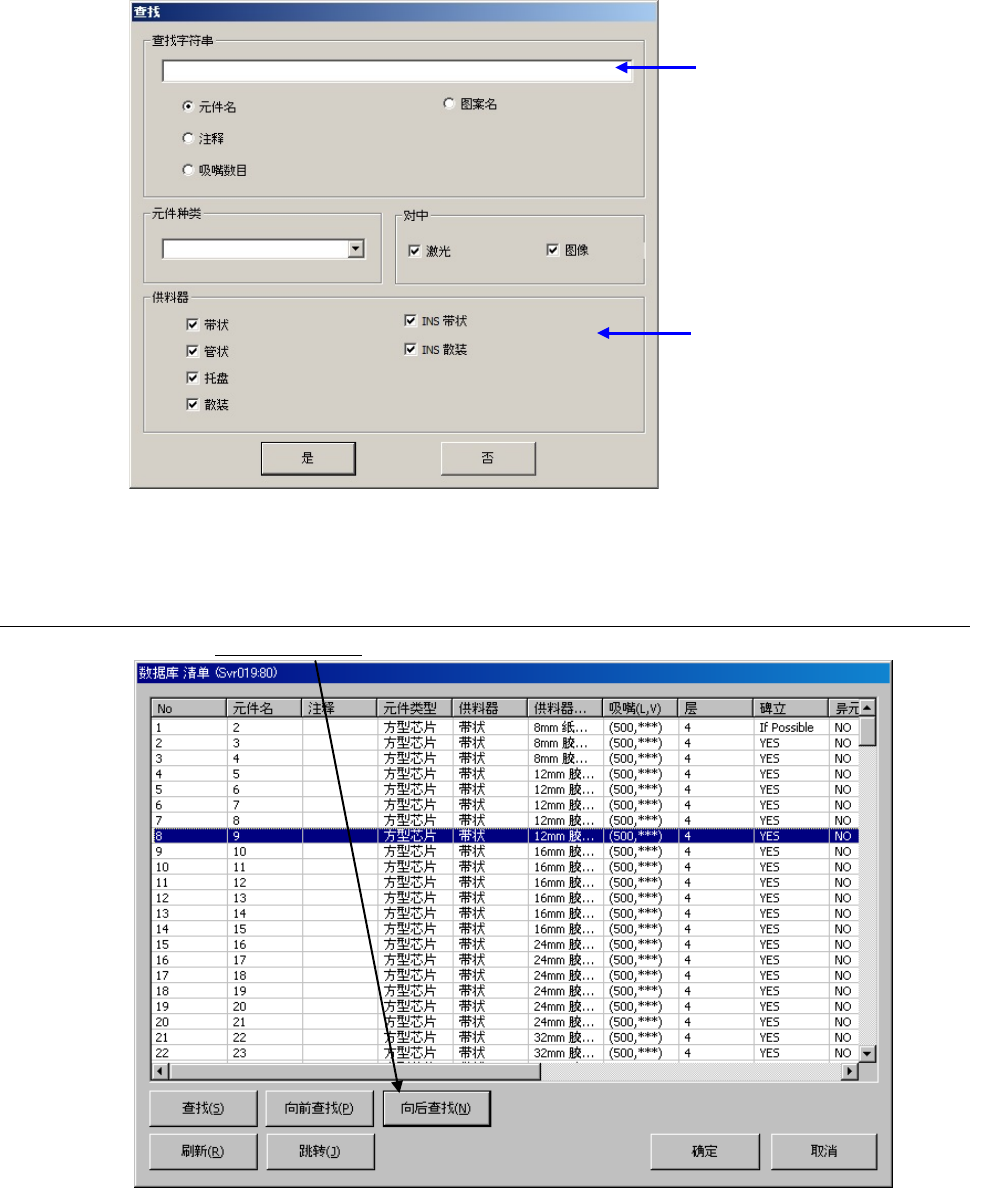 EPU 使用说明书 第 5 章 数据库 5-7 ②显示如下查找 画面。请指定查 找条件,单击 [ 确定 ] 。 需要进一步缩小 查找范围时,请 指定元件种类 、包装方式、对 中(定心)方 法。 ③ 查找结束后,会显示 「 数 据库 清单 」 ,并着 重显示符合输入条件的数据库中的头一个元件数据。 5-1-3-2 向后查找 在菜单栏中, 单击 「向后 查找」。 显示下一个与查 找条件一致的元 件数据。 选中任意一种查 找选项 输入要查找的…