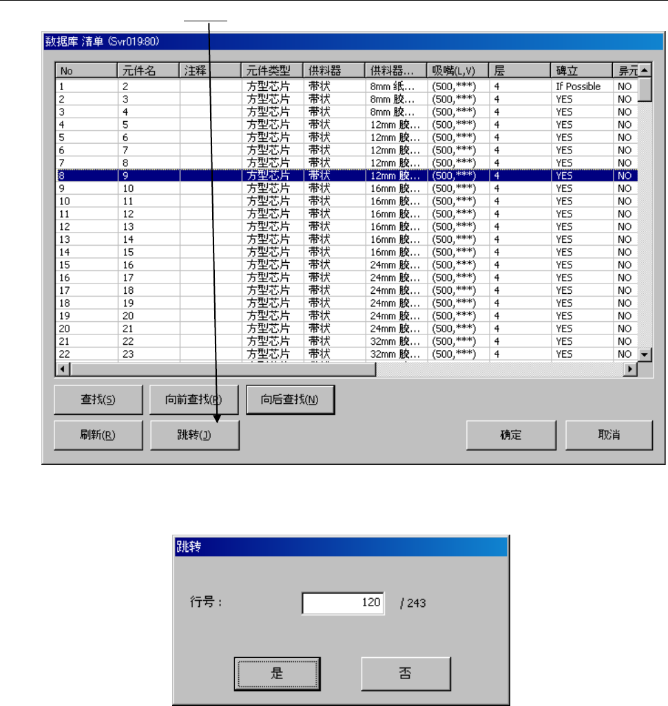 EPU 使用说明书 第 5 章 数据库 5-9 5-1-3-4 跳转 在菜单栏中,单 击 「 跳转 」。 显示如下画面后 ,请输入跳转目 标元件数据号 码。 单击 [ 是 ] 跳转到目标元件。