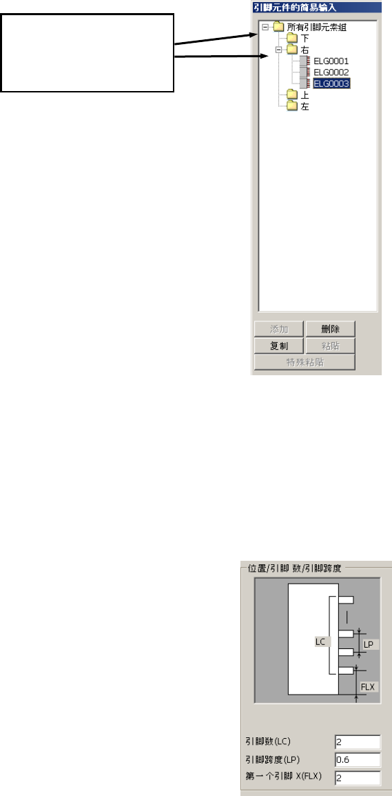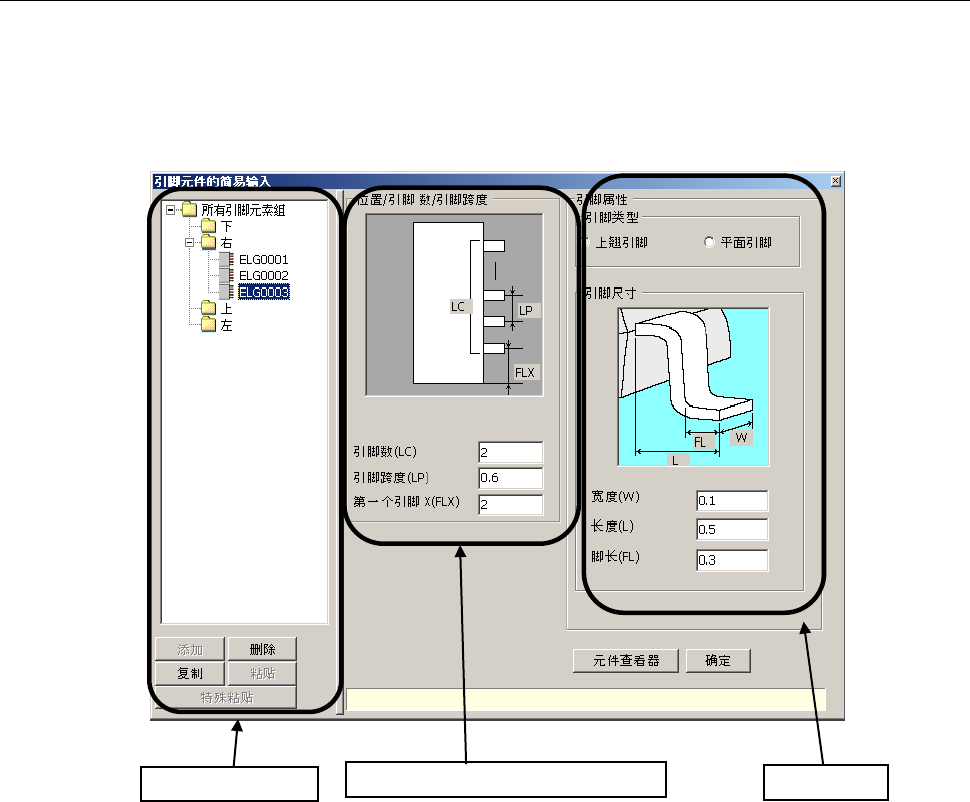 引脚元件简易输入画面由“引脚元件组一览”、“引脚位置、引脚数、引脚间距”、“引脚特征”