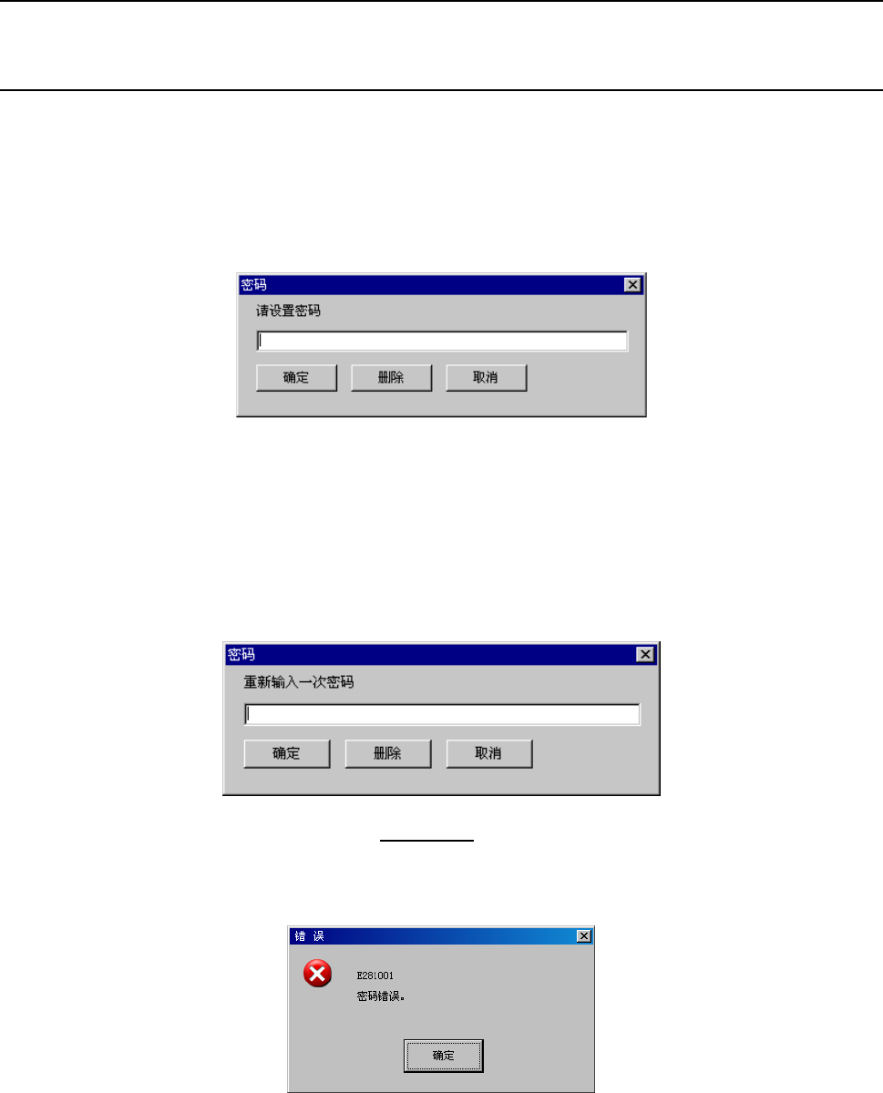 EPU 使用说明书 第 3 章 EPU 设置 3-3 3-3 密码 在进行 EPU 设置时,需要进行与 EPU 有关的所有设置,必须输入密码,否则不能修改设置。 3-3-1 设置密码 安装后第一次启动时,会显示设置密码画面。请设置密码。 (1) 设置密码。 在「设置密码」画面中设置密码。 系统中可用的字符为英文字母和数字,最多为 9 个字符。 ( 全角字符、符号不能用 ) 。 输入后,请单击「确定」按钮。 单击「删除 」 按钮后,所…
