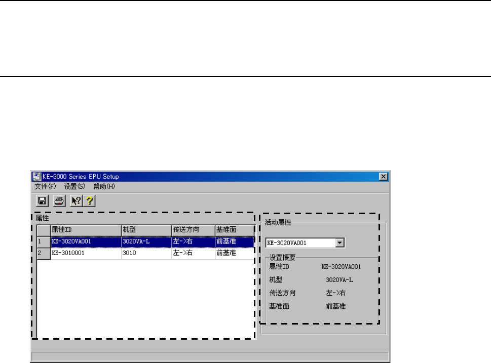 EPU 使用说明书 第 3 章 EPU 设置 3-6 3-4 启动画面 预先制作多个站台属性,激活其中一个,即可选择 EPU 的操作环境。 输入的密码正确时,即可显示设置 EPU 的主画面。 3-4-1 主窗口 输入密码后,即可打开下列 EPU 设置的主窗口。 在 EPU 设置画面上显示已注册的站台属性列表和当前的活动属性概要。 第一次启动 EPU 设置时,请先设置站台属性。 详细说明请参见「 3- 7 设置站台属性」。 已经编辑过属性…
