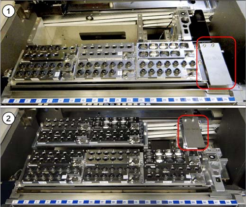 zwischen der ersten Pipettenwechsler-Reihe und der Pipettenstation installiert, wenn zwei W5 Magazine