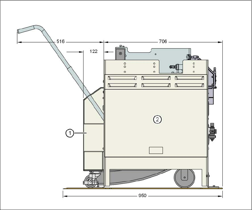 図 6.4 - 3 部品トロリー付き結合ステーション - mm 単位の寸法