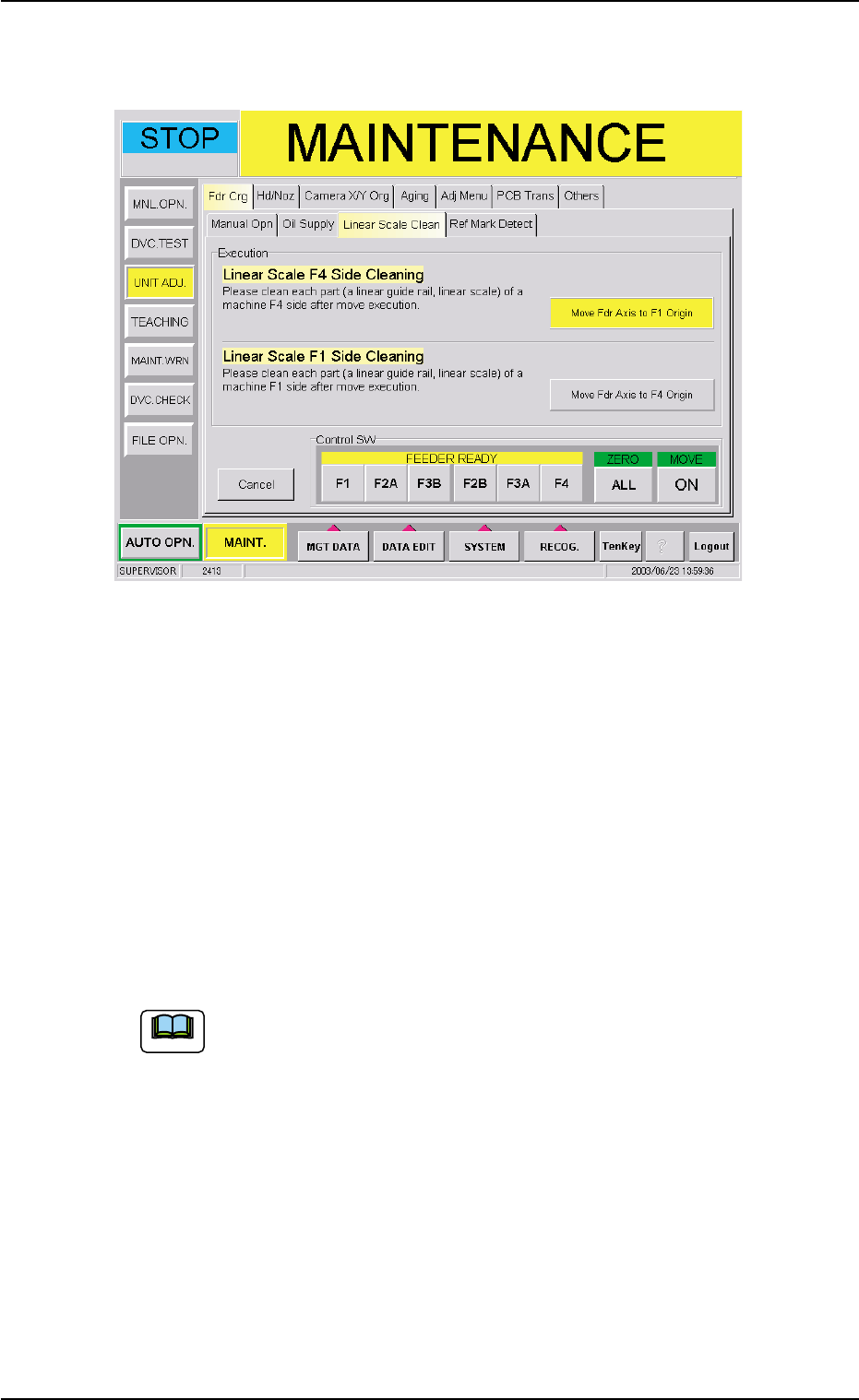 1.4 Maintenance Method (2 ) When the [Start Linear Scale Cleaning] button is pressed in the "Linear Scale Clean" tab sheet, the following sheet appears. Fig. 4A86-2 (3) Press the [Move Fdr Axis to F1 Origin] bu…