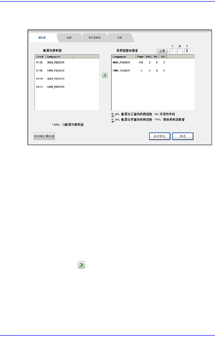 在右边框中显示每个部品的装贴点数,已配置的带式喂料器数和需要配置的喂
