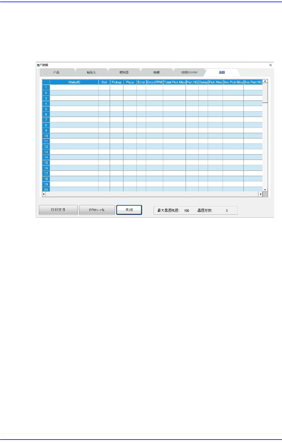 9-8 Cutting-edge Modular Mounter HM Series A dministrator's Guide 9.1.7. 晶圆 您可以查看每个晶圆的生产信息。 详细内容请 参考 “8.2.3.6. 请参考 晶圆 ” 。 ( HM520h 专用) 图 9.7 “ 晶圆 ” 选项卡对话框