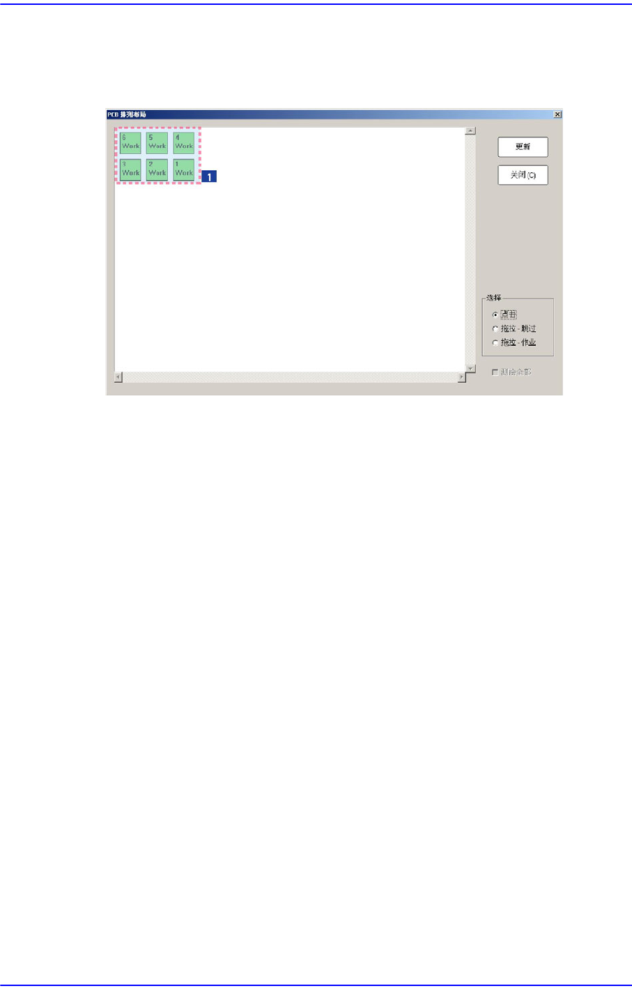 2-32 Cutting-edge Modular Mounter HM Series A dministrator's Guide <PCB 排列布局 > 按钮 Array PCB 内的小型 PCB 中选择不工作的小型 PCB 时, 在观察 Array PCB 内的小 型 PCB 的分布状态 , 决定对相应的小型 PCB 工作与否时使用。 1: 小型 PCB <Selection> 选框领域 …