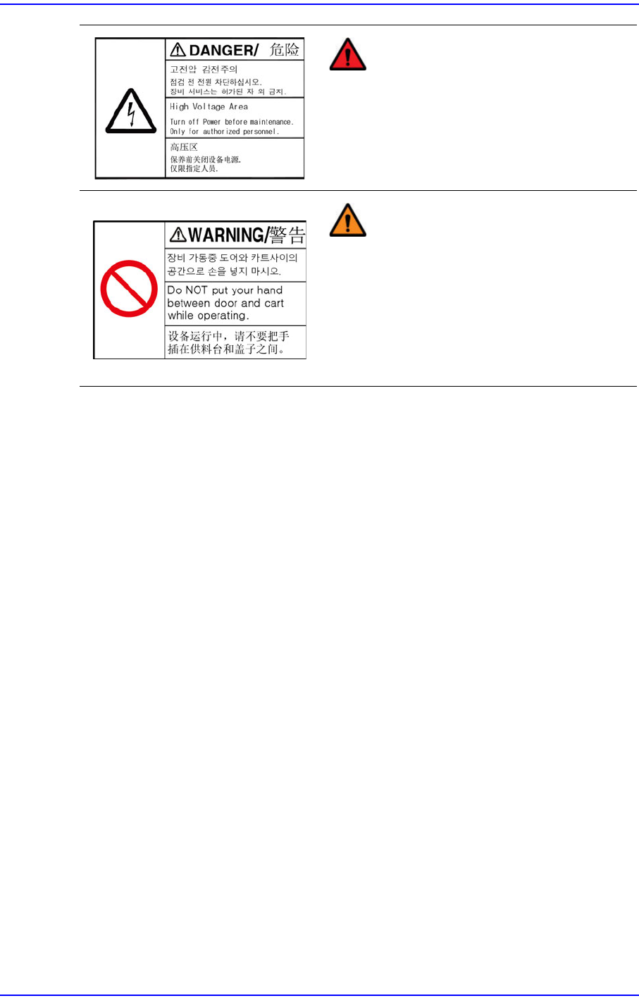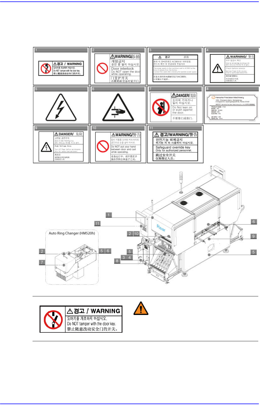 Cutting-edge Modular Mounter HM Series A dministrator's Guide vi 设备外观的背面 在设备的背面粘贴着下列标签 图 1.2 设备外观的背面上粘贴的 安全标签 警 告 禁止改造护门开关 (door Key) 禁止随意改动安全门的开关。