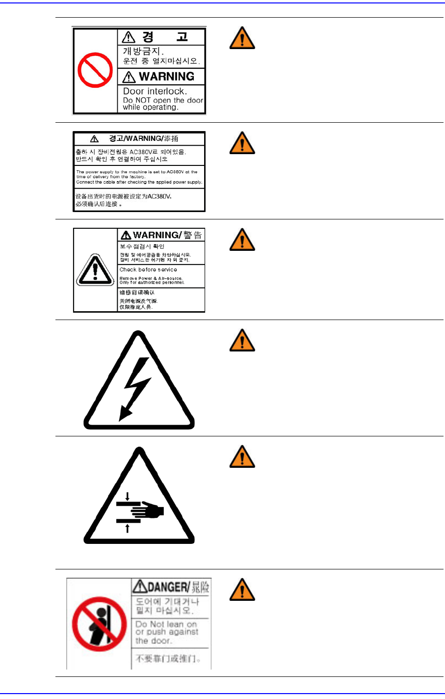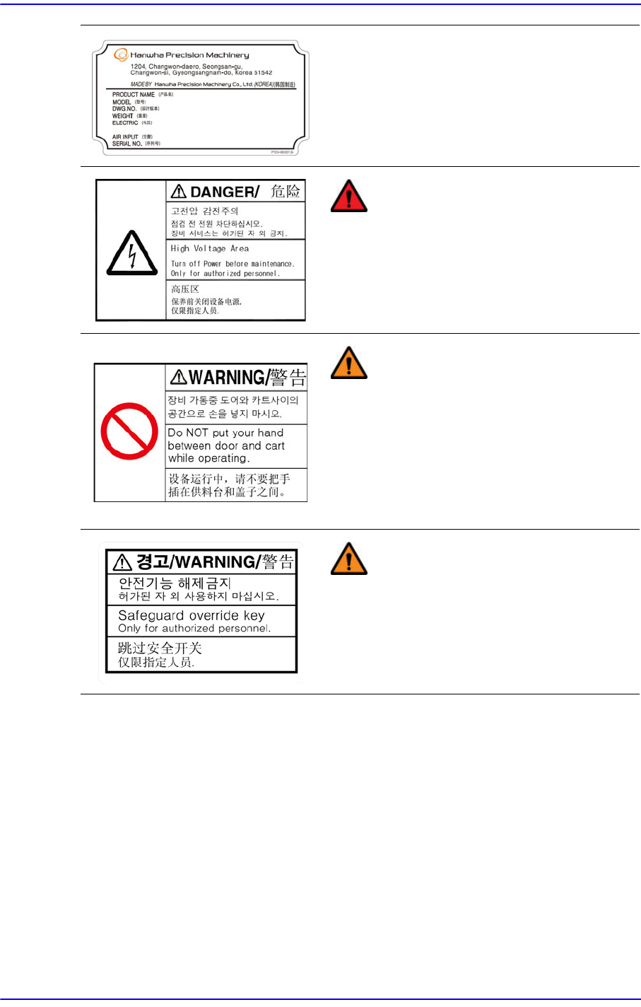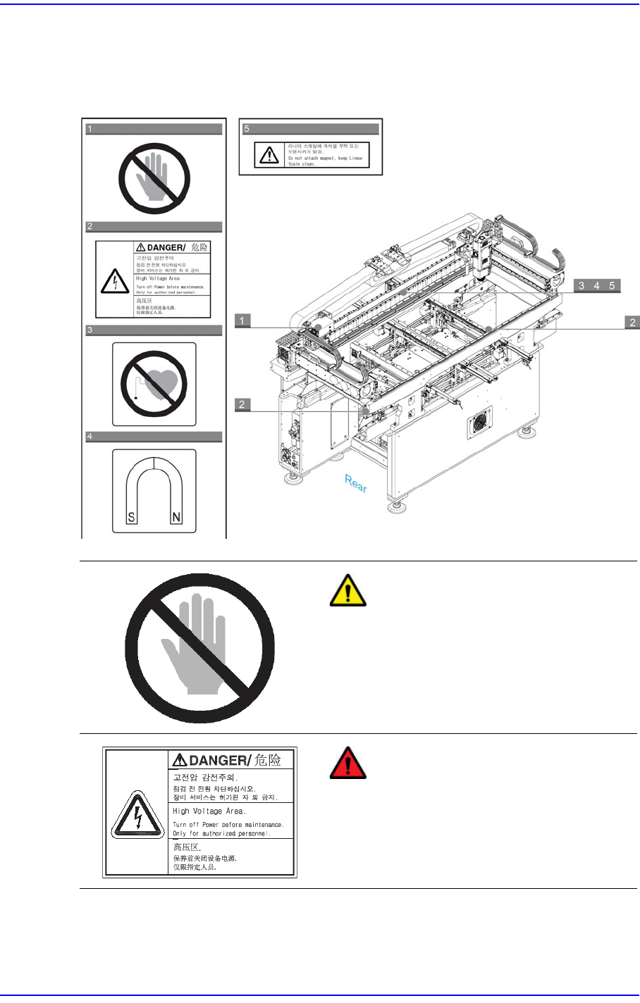 Cutting-edge Modular Mounter HM Series A dministrator's Guide viii 设备铭牌 (Machine Name Plate) 标有设备的型号名称和序列号 以及基本设备 规格。 请检查铭牌上标注的气动和电 压规格, 并按 照规格操作设备。 危险 小心触电 (禁止靠近) 。 维护前, 请务必关闭主电源开关, 并注意残 留电流, 避免遭受致命伤害。 警告 操作设备时请勿把手…