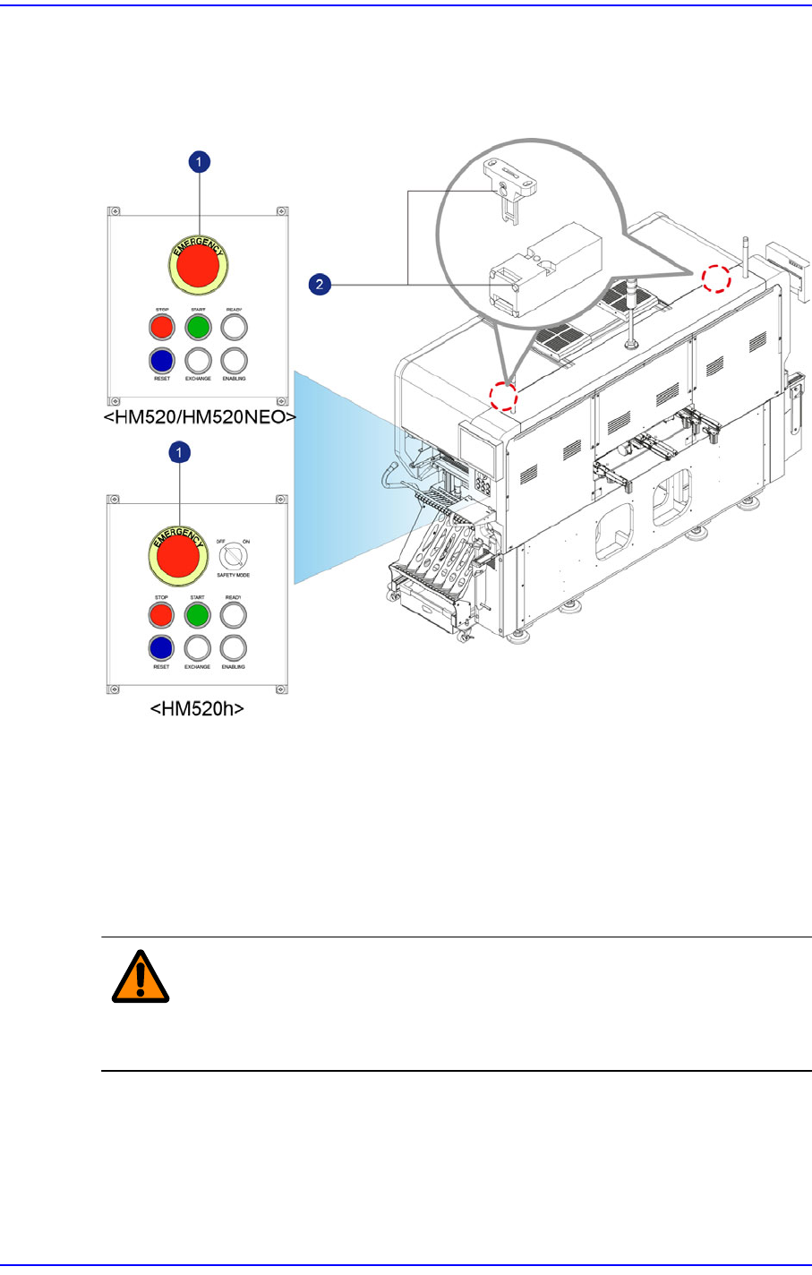 Cutting-edge Modular Mounter HM Series A dministrator's Guide xii 2) Door Lock 开关 在本设备的运行当中 (Run 运行状态时 ) , 打开门时, 门开关就起动, 设备处于紧 急停止状态。 关上门即可解除紧急停止状 态。 在 此状态下, 重新运行设备时, 先 按下运行面板上的 ‘READY’ 按钮后再按 ‘START’ 按钮。 警 告 如果人为的拆除…