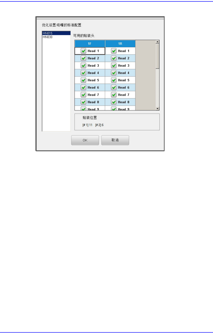6-7 优化 图 6.4 " 优化设置 : 吸嘴的标准配置 " 对话框 基本上所有喷嘴可以在任何 Head 进行作业, 因此在所有 Head 都有校验符。 但是有时也会出现某个特定的吸嘴 必须在特定的头上作业 , 而且 使用者想给一 个特定的 head 指定一个特定的吸 嘴时使用它。 上图显示吸嘴 HN015 可以在头 1 和头 20 之间的任何头 上作业。 < 使用 的头部 > 检查 盒组 可指定适…