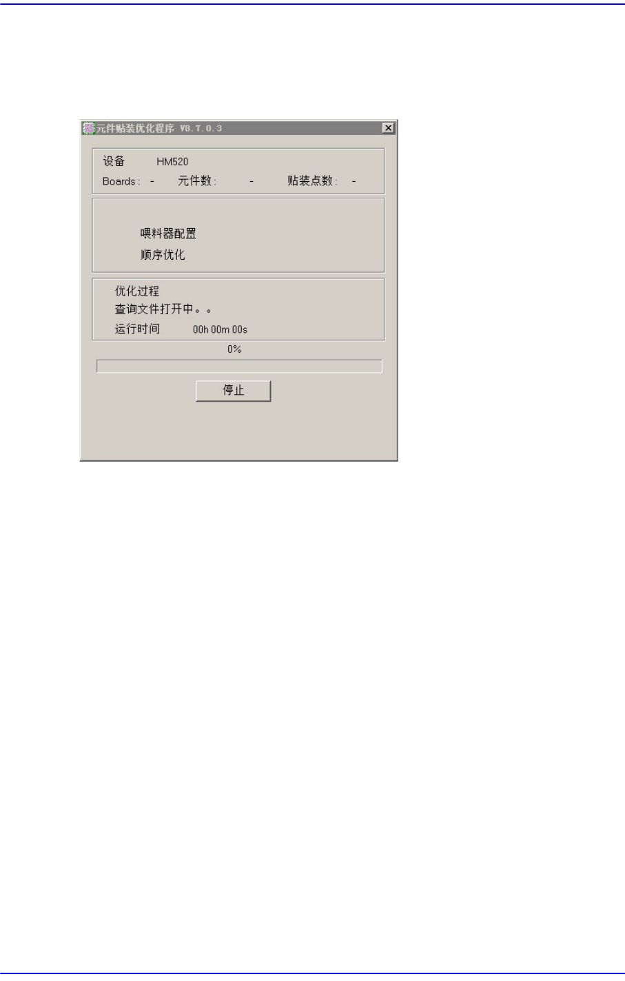 6-14 Cutting-edge Modular Mounter HM Series A dministrator's Guide 6.7. Optimizer Dialo g 点击 < 执行最佳化 > 按钮则执行最佳化 。 图 6.7 " 优化器 " 对话框 第一部分显示的是设备型号, 部品种类数及总 装帖点数。 第二部分通过检查标记显示优化的 进行阶段, 显示的检查标记即目前进行的阶段 。…
