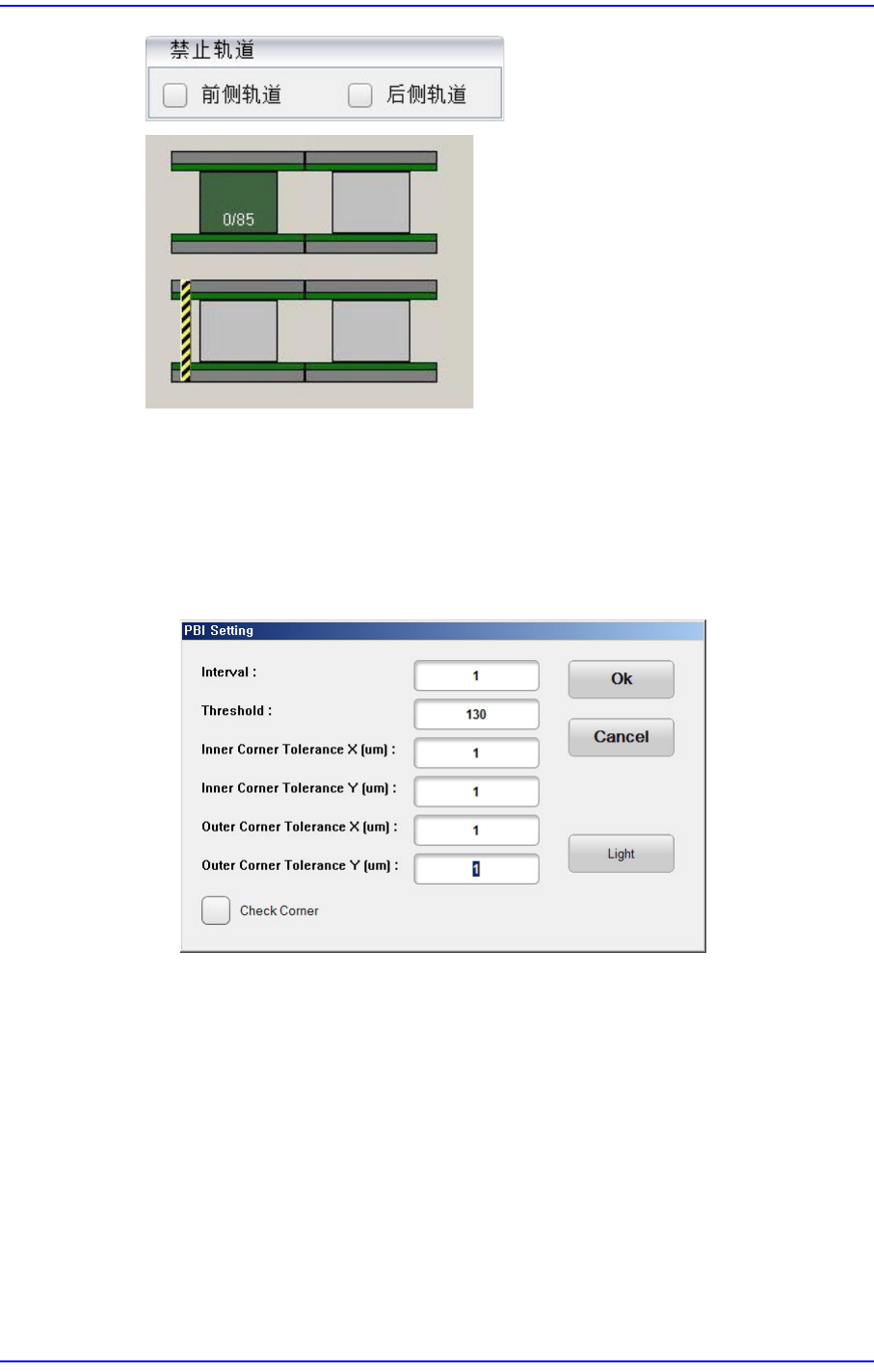 8-17 生产设置 <PBI> 领域 可以设定是否在 PCB 生 产过程中使用 Shield Can 元件的 PBI 检查并且设定实行 PBI 时的 选项。 <Setting> 按钮 可以设定进行 PBI 检查 时需要实行的选项。 <Interval> 编辑框 可以设定 PBI 的检查周期。 <Threshold> 编辑框 该基准值可以在检查 PBI 时让视觉区 分出屏蔽罩…